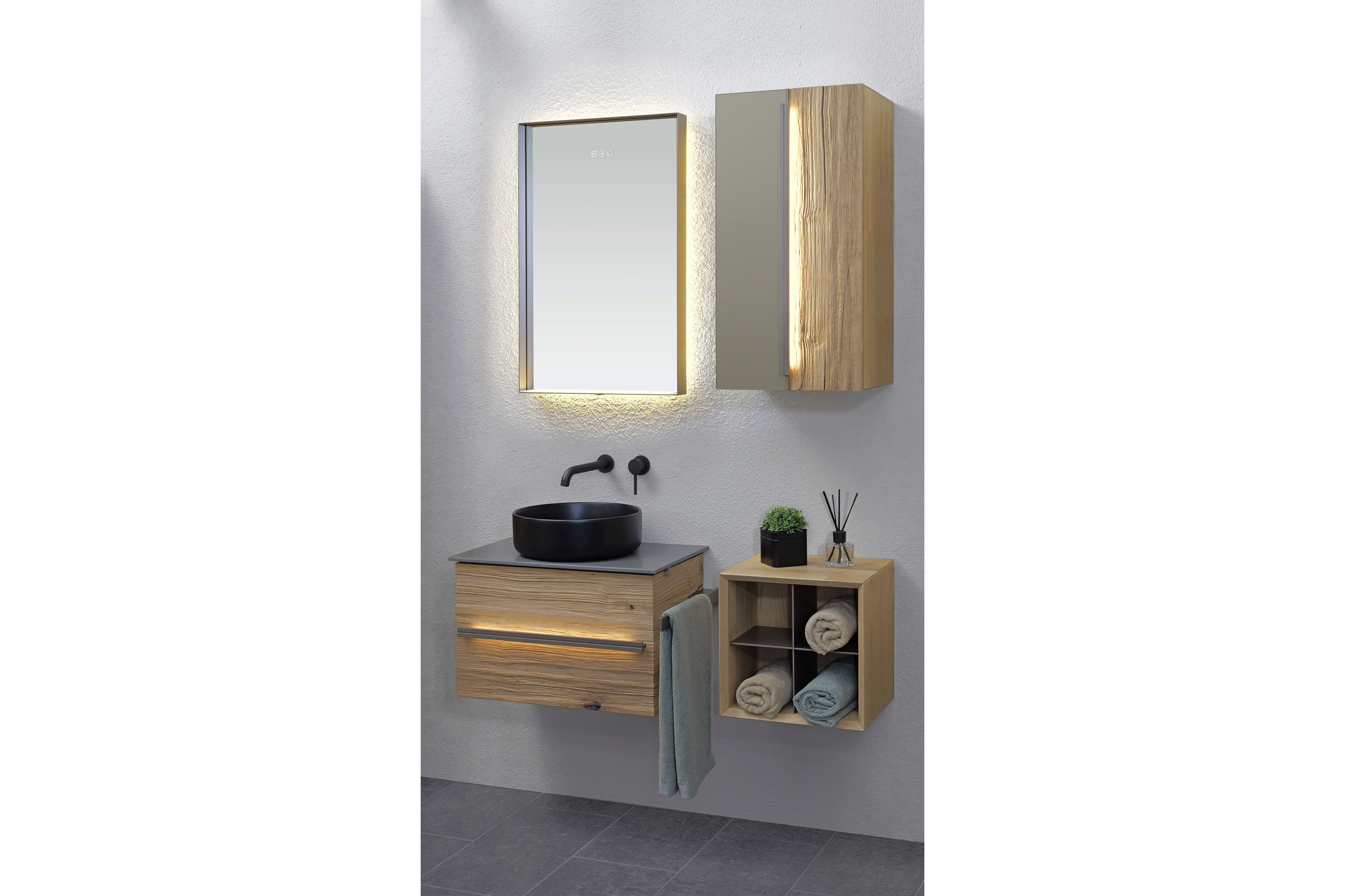 - Waschtischunterschrank mit 2 Schubkästen mit Spaltholzfront und LED-Griffbeleuchtung nach oben und unten inklusive Sensorschalter, Utensilienbox klein, Utensilienbox groß, Kosmetikeinsatz fein und Kosmetikeinsatz grob