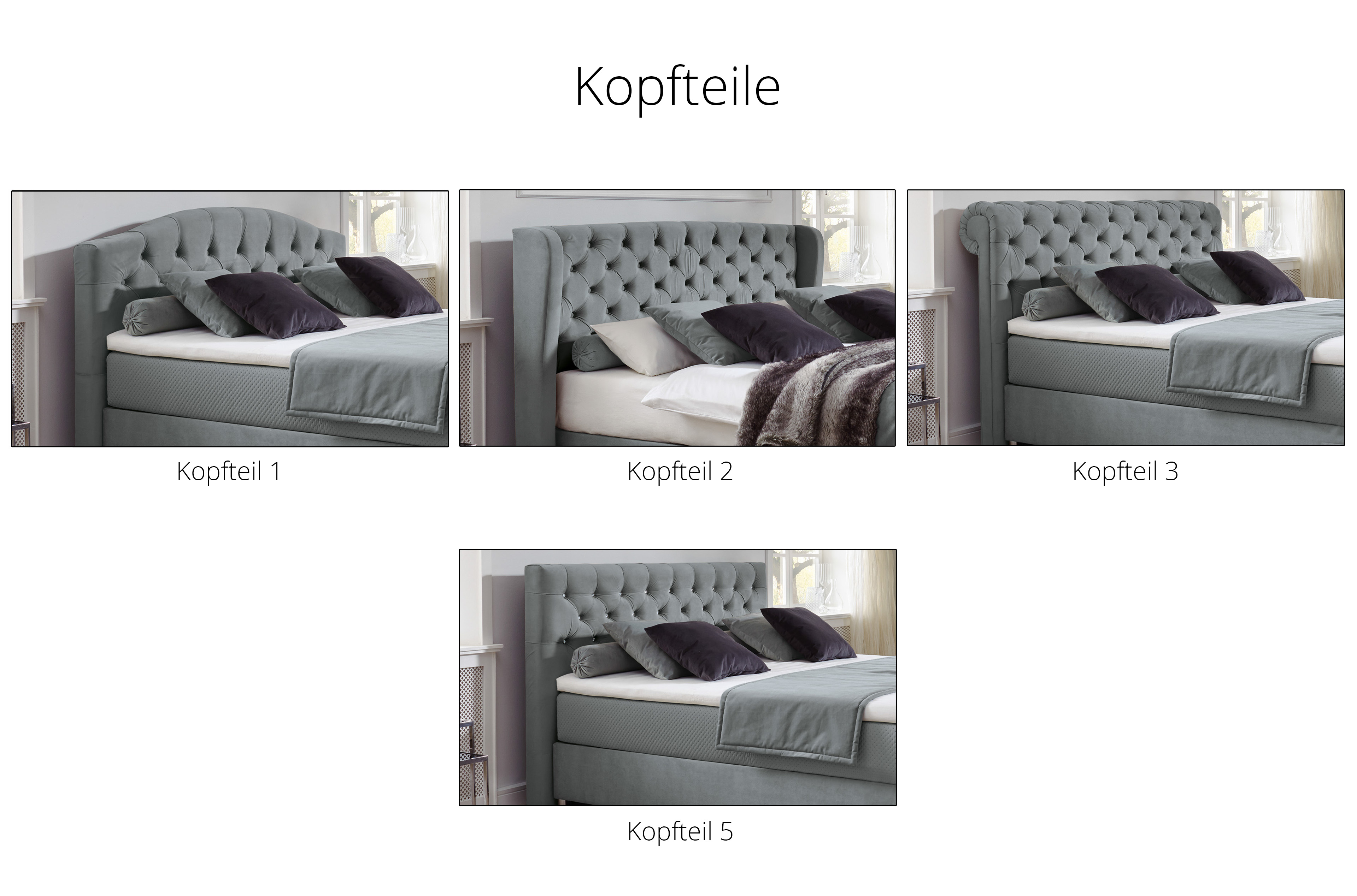 - Kopfteil: KT1 mit Chesterfieldheftung und Knopfsteppung