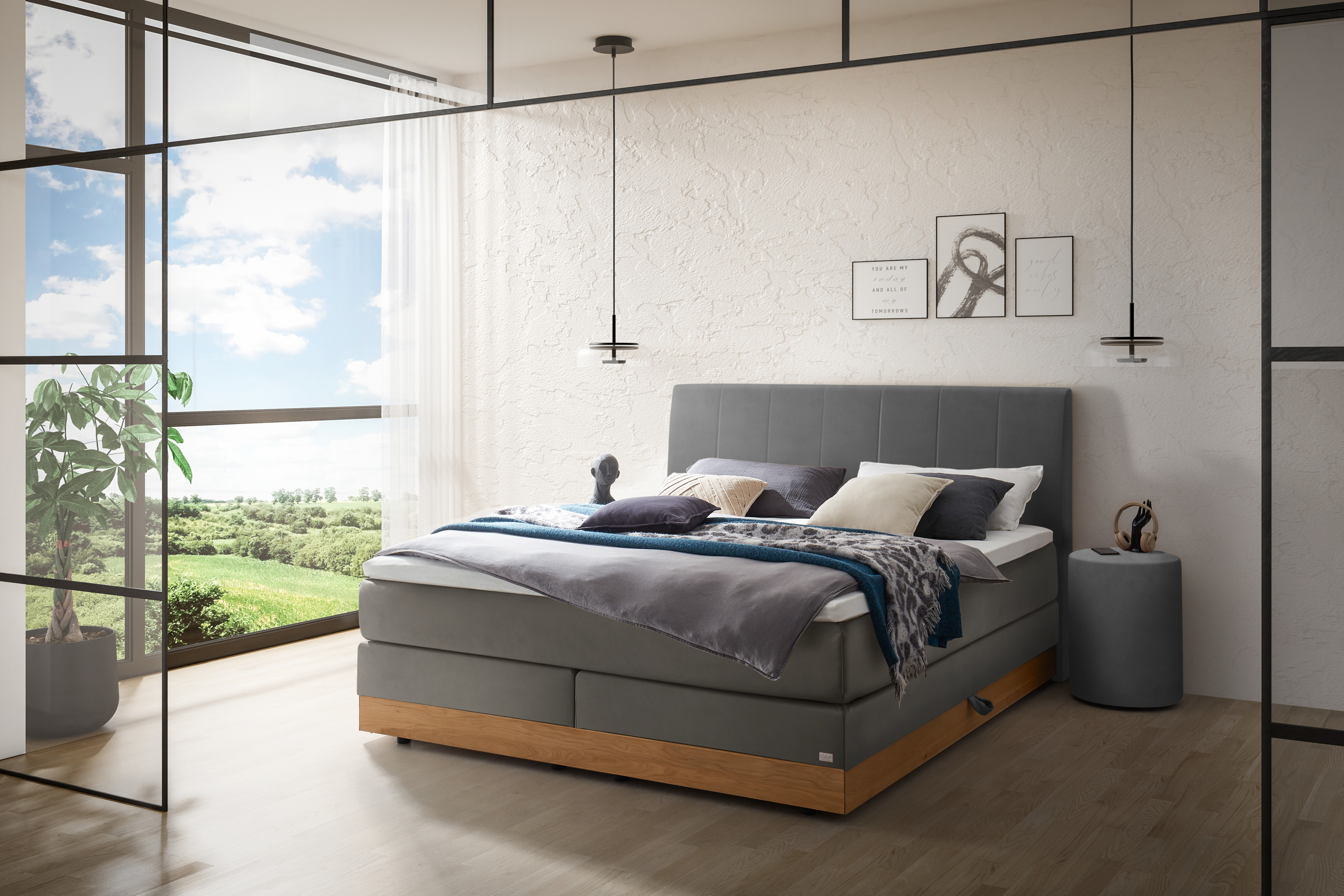 Hochwertige Qualität und modernes Design verbinden das elegante Boxspringbett Pronto Pedrosa von Hasena. Es überzeugt in einem geschmackvollen grauen Microfaser und einem massiven Holzsockel aus geölter Eiche, in dem sich ein zweiteiliger Bettkasten verbirgt. Der besondere Komfort des stilvollen Modells Pedrosa wird durch den mehrschichtigen Aufbau des Möbelstückes abgerundet. Die Unterbox wurde mit exklusivem Bonell-Federkern gefertigt und wird durch die anschmiegsame Wendematratze aus Tonnen-Taschen-Federkern im Härtegrad zwei und drei komplementiert. Die dritte Komponente der Boxspringausstattung, die Sie passend auf Ihre gewünschten Schlafgewohnheiten abstimmen können, ist der Topper. Diesen können Sie über unsere Zusatzoptionen mit einem festen, mittleren oder soften Liegegefühl auswählen. Somit besitzt das Boxspringbett eine Gesamtliegehöhe von ca. 62 cm, welche die Leichtigkeit besonders beim Hinlegen und Aufstehen steigert. Zusätzlich können Sie Ihr neues Schlafzimmermöbel optimal auf Ihre individuellen Bedürfnisse abstimmen und das Bett in verschiedenen Liegeflächen sowie Bezügen bestellen. Pronto von Hasena - Boxspringbetten zum Wohlfühlen.