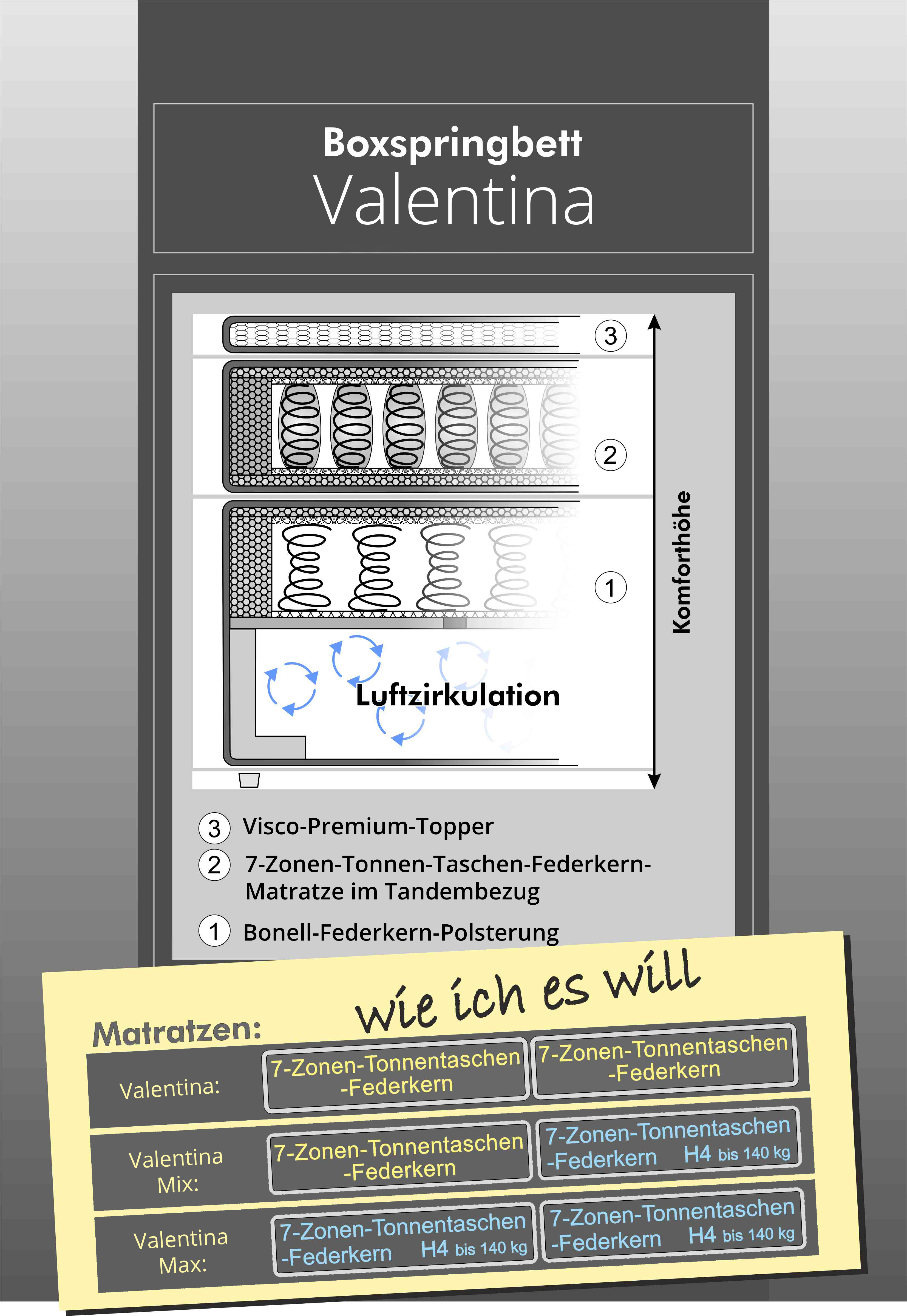 - Matratze: 7-Zonen-Tonnen-Taschen-Federkern (ca. 372 Federn auf 90 x 200 cm)