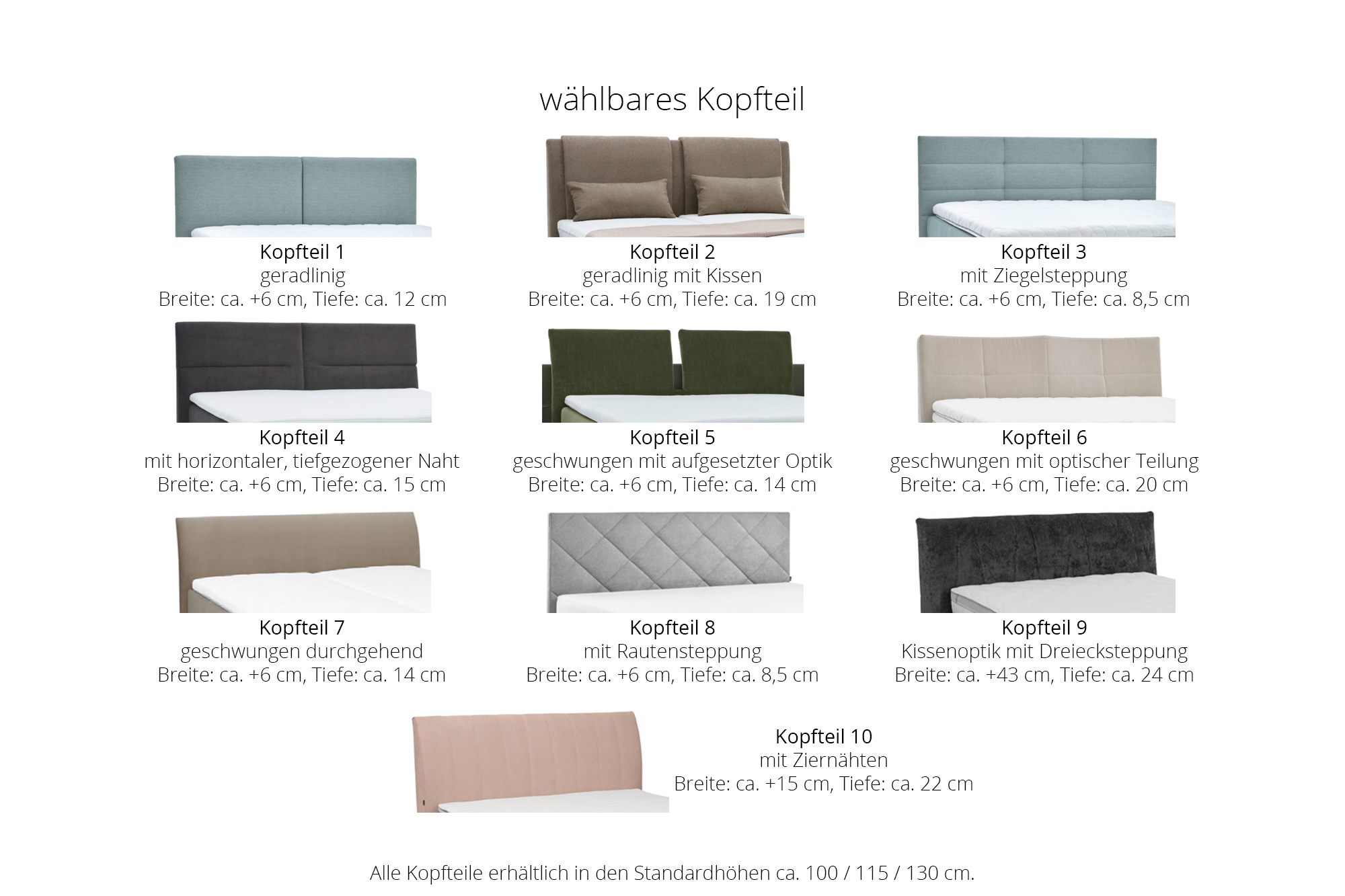 Hinweis! Alle Kopfteile sind in den Standardhöhen ca. 100, 115 und 130 cm erhältlich, die Kopfteile 1, 2, 3 und 8 sind zudem auf Anfrage zentimetergenau bis auf ca. 75 cm kürzbar.