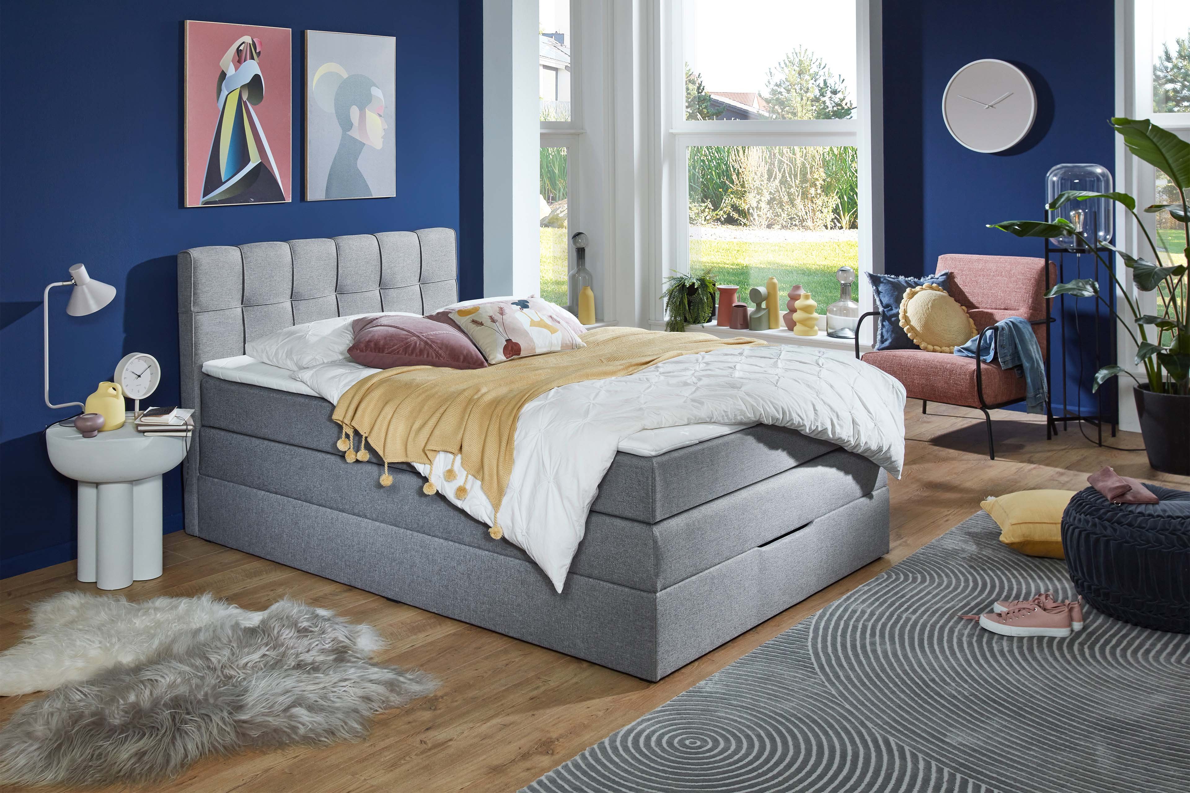 Peppen Sie Ihren Alltag auf – mit Möbeln, die Ihnen ein Lächeln aufs Gesicht zaubern. Dekoriert mit farbenfrohen Akzenten als Kontrast zu ihrem zurückhaltenden Farbton, verleihen sie jedem Raum eine frische, einladende Atmosphäre. Nicht nur das klassische Sofa oder der Sessel, sondern auch ein Bett in dezentem Grau lässt sich so ganz nach Ihrem Geschmack transformieren, so zum Beispiel das Boxspringbett Luca von Sofa-Team. Mit einer Liegefläche von ca. 140 x 200 cm dient Ihnen dieser Allrounder entweder als kuscheliges Doppelbett in kleinen Schlafzimmern oder als luxuriöse Entspannungsoase ganz für Sie allein. Das Boxspringbett erweist sich dabei nicht nur optisch als besonders praktisch für jeden Anwendungsbereich: Vom Fußende aus lässt es sich aufklappen und bietet einen geräumigen Bettkasten unterhalb der Box, mit dem Sie wertvollen zusätzlichen Stauraum gewinnen. In Sachen Komfort bietet Ihnen Luca II hier eine Matratze mit Tonnen-Taschen-Federkern und sieben Liegezonen für eine hohe Punktelastizität, zudem ist ein Topper bereits im Angebot enthalten. Bestellen Sie noch heute und schon bald hält das Boxspringbett von Sofa-Team bei Ihnen Einzug.