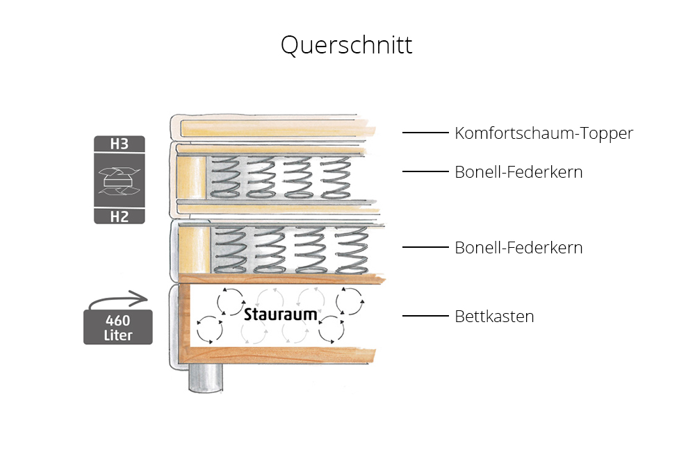 - Funktion: geräumiger Bettkasten mit Ventilationsöffnungen und Eingriff-Einschnitt im Deckel, vom Fußende zu öffnen mittels Gasdruckfeder, Fassungsvermögen ca. 460 Liter