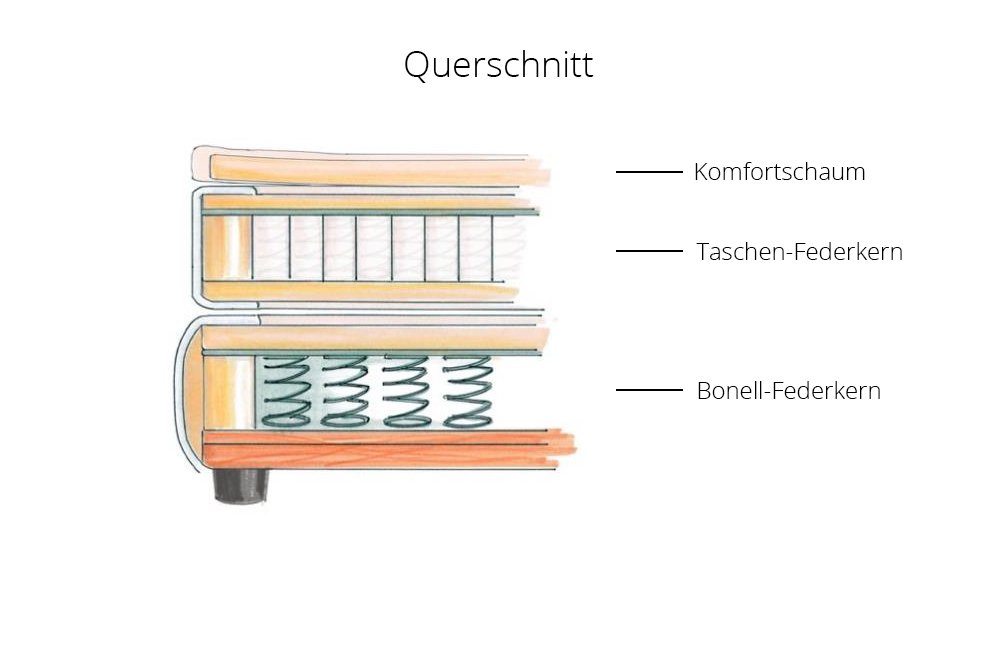 - Matratze: Duett - 7-Zonen-Taschen-Federkern, im Bezug wendbar mit einer weichen (H2) und einer festen (H3) Liegeseite, mit fest vernähtem Komfortschaum-Topper