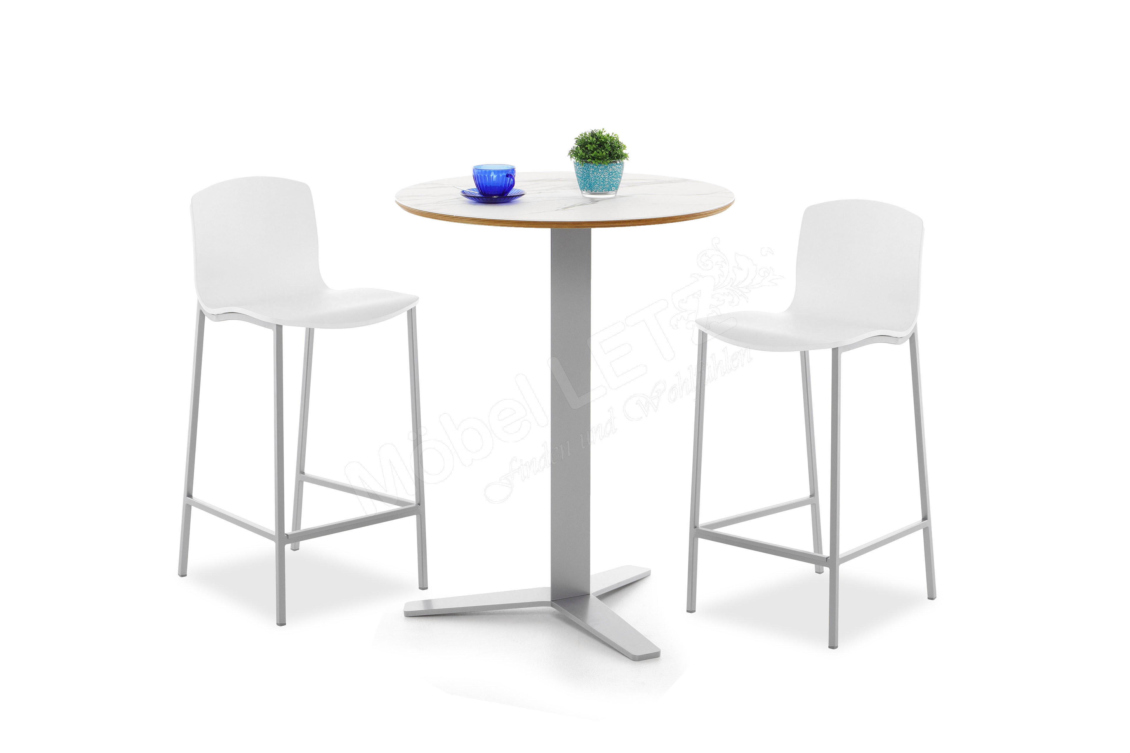 Mit einer großen Portion Leichtigkeit und Moderne hält der Kollektion Letz Bartisch Peliccan in Ihrem Zuhause Einzug. Das abgebildete Modell präsentiert sich mit einer runden Tischplatte, welche einen Durchmesser von ungefähr 70 cm hat. Diese wurde aus edler Keramik im Farbton Calacatta gefertigt und wird von einem aluminiumfarbenen Säulengestell getragen. Geradlinige und klare Formen reduzieren sich hierbei auf das Wesentliche und bringen die schlichte Ästhetik hervorragend zur Geltung. Gern können Sie auch bis zu vier Barhocker Seven in den Warenkorb legen, um Ihren Essplatz stilvoll zu komplettieren. Diese besitzen eine weiß lackierte Sitzschale und ein vierbeiniges Stahl-Gestell in der Farbe Aluminium. Peliccan aus der Kollektion Letz - eleganter und hochwertiger Bartisch.