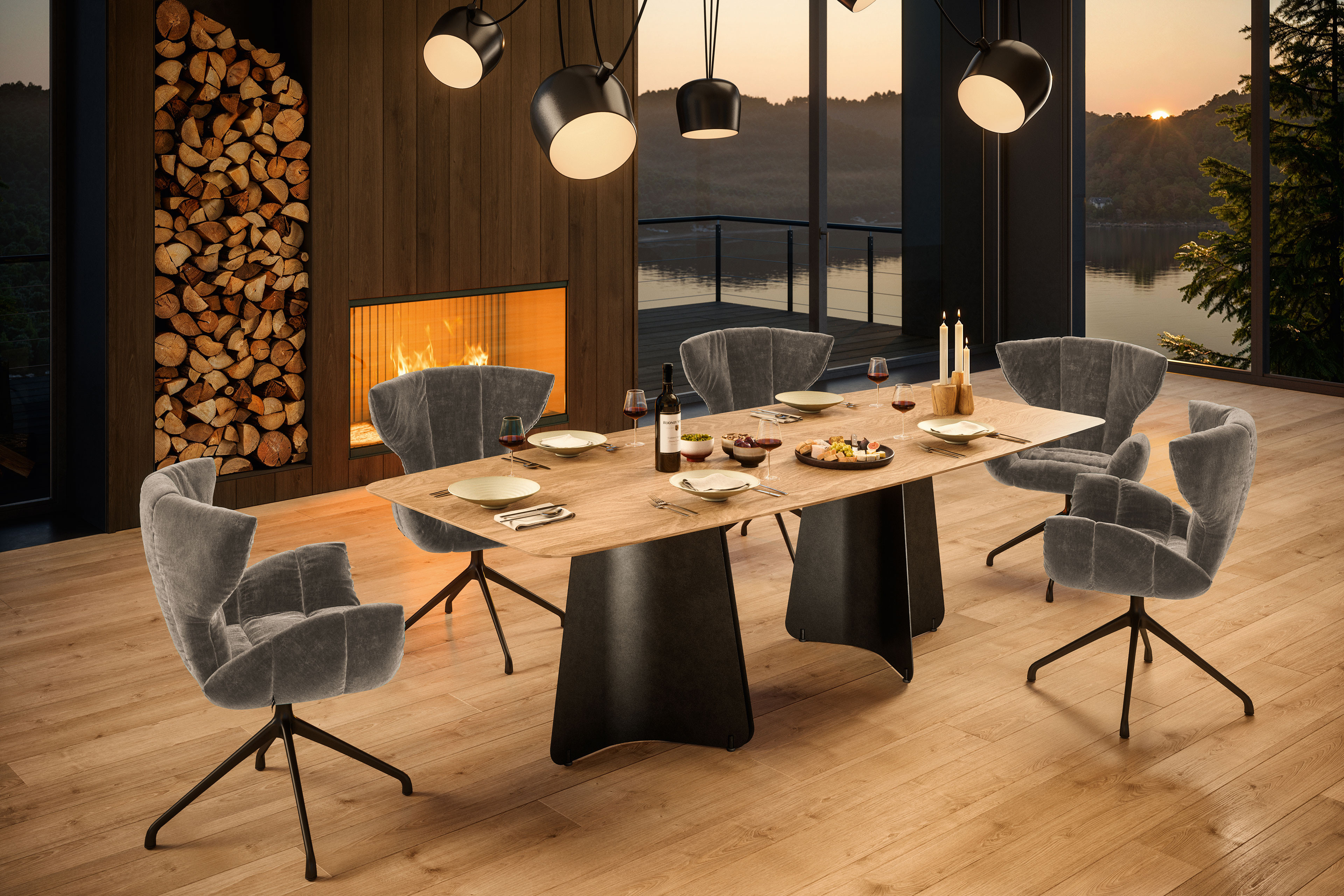 Der Esstisch Maona aus dem Hause Bretz ist weit mehr als ein Möbelstück – er ist eine architektonische Komposition, geschaffen für Räume mit Anspruch und Persönlichkeiten mit Stilbewusstsein. In ihm verschmelzen Materialität, Form und Charakter zu einem Statement von unverwechselbarer Präsenz. Die Tischplatte aus massiver Eiche verkörpert natürliche Kraft und zeitlose Eleganz zugleich. Sorgfältig natur matt lackiert, offenbart das Herzstück eine faszinierende Textur, die das Licht subtil einfängt und jedem Raum eine sinnliche Tiefe verleiht. Die lebendige Maserung bleibt spürbar – ein Tribut an die Authentizität des Materials, interpretiert in einer modernen, souveränen Ästhetik. Getragen wird diese ausdrucksstarke Platte von einem kraftvollen Stahluntergestell, pulverbeschichtet in Black Onyx. Die dunkle Oberfläche unterstreicht die skulpturale Wirkung des Designs und bildet einen spannungsvollen Kontrast zur organischen Struktur des Holzes. Stabilität und Leichtigkeit treten hier in einen Dialog – klar, selbstbewusst, kompromisslos hochwertig. Mit einer großzügigen Länge von etwa 220 cm bietet der Bretz Esstisch Maona Raum für Begegnung, Inspiration und Genuss. Ob als Bühne für ausgedehnte Dinnerabende, als repräsentativer Mittelpunkt eines offenen Wohnkonzepts oder als kreativer Treffpunkt für neue Ideen – dieser Tisch schafft Atmosphäre. Und weil Individualität ein zentrales Element zeitgemäßen Wohnens ist, sind weitere Ausführungen wählbar, sodass sich das Schmuckstück harmonisch in unterschiedlichste Interieurs integrieren lässt. Maona ist kein Tisch für den Moment, er ist ein Versprechen an Beständigkeit, Designkultur und emotionale Qualität. Ein architektonisches Statement, das Räume definiert und ein wundervolles Ambiente entstehen lässt – kraftvoll, elegant und von unverwechselbarer Identität.