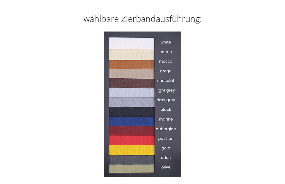 Bei einer zweifarbigen Ausführung ist ein Zierband nur auf dem Hauptbezug möglich!