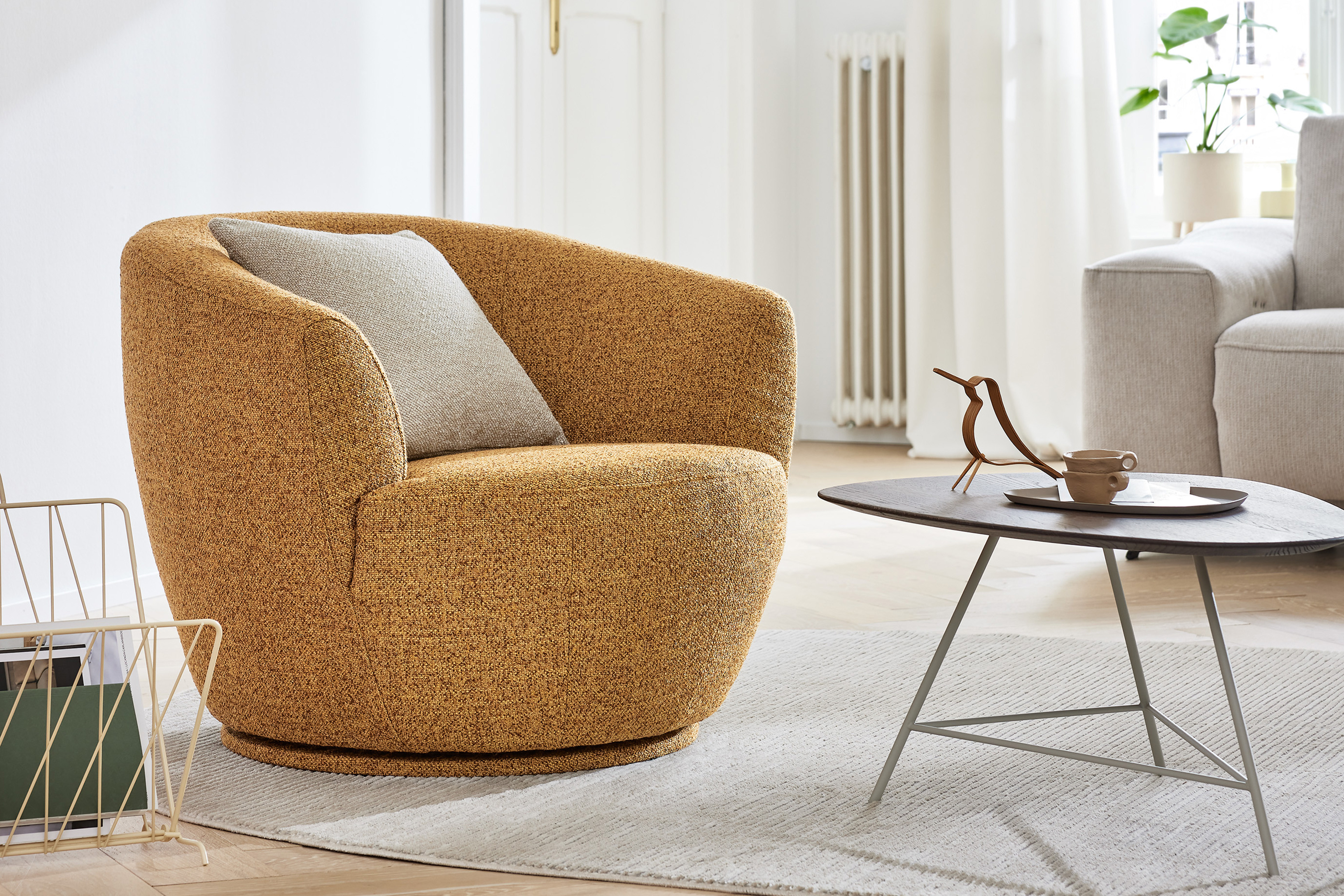 Ob als Solist in der Leseecke oder stilvoller Blickfang im Wohnzimmer - der charmante Einzelsessel MR 9455 von Musterring fügt sich mühelos in fast jeden Wohnbereich ein und wird schnell zu Ihrem neuen Lieblingsplatz. Mit seinem eleganten Stoffgewand in einem warmen Farbton sowie seiner sanft gerundeten Silhouette strahlt dieses Möbelstück nicht nur absolute Behaglichkeit und Ruhe aus, sondern bereichert Ihr Zuhause ebenfalls mit zeitloser Eleganz. Das Design wirkt mit dem Drehtellerfuß, welcher in Bezug auf den Sessel angepasst wurde, besonders klar und harmonisch, wodurch ein stimmiges sowie modernes Gesamtbild entsteht. Die sorgfältig abgestimmte Polsterung aus Polyätherschäumen sowie einem HR-Schaum vermittelt schon beim ersten Platznehmen ein Gefühl von Geborgenheit und schenkt Ihnen ein angenehmes Sitzempfinden, sodass Sie Ihre gemütlichen Lesestunden oder Filmabende genießen können. Ein besonderes Highlight ist die 360°-Drehfunktion: Dank dieser Ausstattung passt sich der Musterring Sessel an jede Situation an und wird zum idealen Begleiter im Alltag. Sollte Ihnen das Bouclé-Outfit in der Farbe "whisky" nicht gefallen, finden Sie unter der Rubrik "Wunschbezug - Farbe ändern" eine große Auswahl an diversen Bezugsmaterialien mit hellen sowie dunklen oder dezenten und kräftigen Farbnuancen. Der Drehsessel MR 9455 von Musterring lässt keine Wünsche offen und ist eine Einladung zum Entspannen sowie Wohlfühlen.