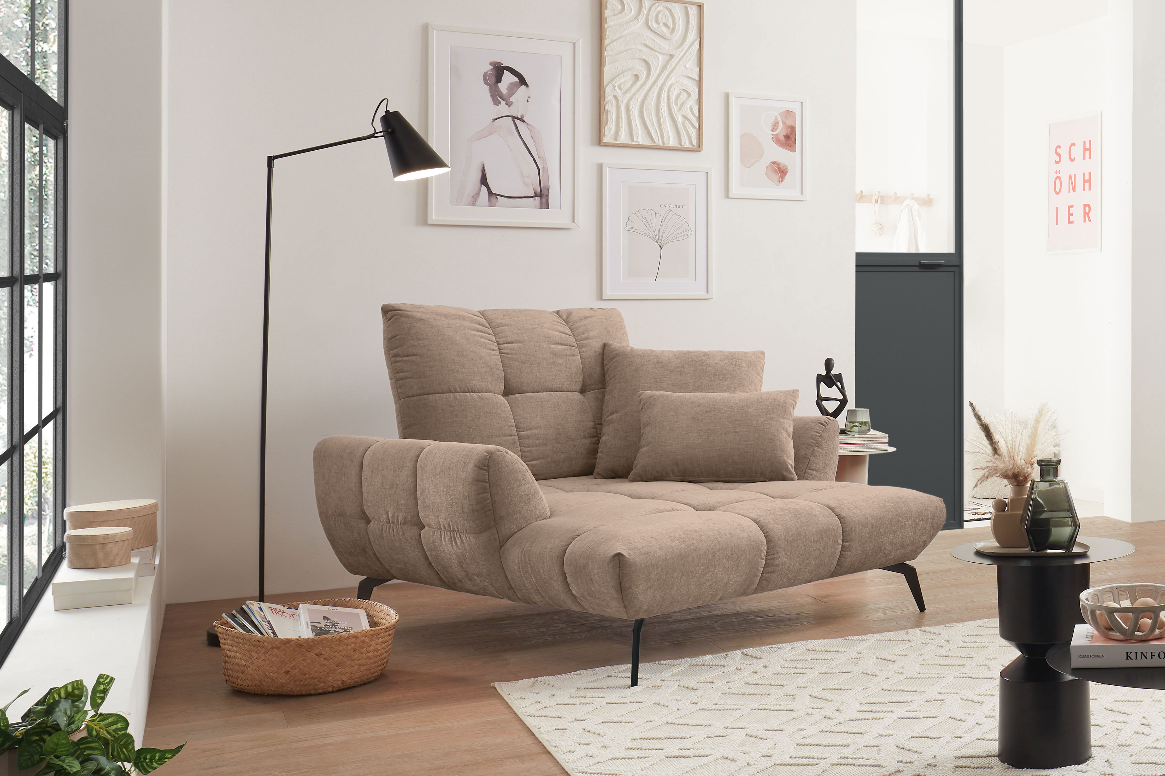 Ein Möbelstück, das sofort ins Auge fällt und gleichzeitig zum Verweilen einlädt: Der Loveseat Malibu-LE26 von set one by Musterring setzt mit seinem hellen Braunton stilvolle Akzente und schafft einen Ort für entspannte Momente. Nicht nur die großzügige Sitzfläche, sondern auch die komfortable Polsterung laden dazu ein, sich fallen zu lassen, um den Augenblick zu genießen. Optional kann das Sitzmöbel mit einer Rückenneigungsverstellung ausgestattet werden, um den Sitzkomfort individuell zu erweitern und um Ihre Lieblingsposition zu finden. Die schlanken Metallfüße in Schwarz unterstreichen die moderne Linienführung und verleihen dem Möbelstück eine leichte, zeitgemäße Optik. Auf Wunsch sind die Füße auch in edler Chrom-Ausführung erhältlich. Dank der vielfältigen Planungsmöglichkeiten dieser Serie lässt sich der Einzelsessel flexibel in unterschiedliche Raumkonzepte integrieren. Ob als stilvolle Einzelposition, in Kombination mit einem passenden Hocker oder ergänzt durch einen 2-Sitzer - Malibu-LE26 passt sich Ihren Bedürfnissen an. Werfen Sie gern einen Blick in den Typenplan, er zeigt Ihnen weitere Elemente dieser Serie. So entsteht ein harmonisches Gesamtbild, das sich optimal an Ihre Raumgröße sowie Ihren persönlichen Platzbedarf anpasst. Verschiedene Farben sowie hochwertige Bezugsmaterialien bieten Ihnen zusätzliche Gestaltungsfreiheit und ermöglichen eine individuelle Abstimmung auf Ihr Wohnambiente. Ob der set one by Musterring Loveseat Malibu-LE26 bei Ihnen als gemütlicher Rückzugsort oder als stilvolles Highlight im Wohnbereich eingesetzt wird - der Sessel überzeugt durch seine harmonische Erscheinung sowie mit seiner einladenden Ausstrahlung.