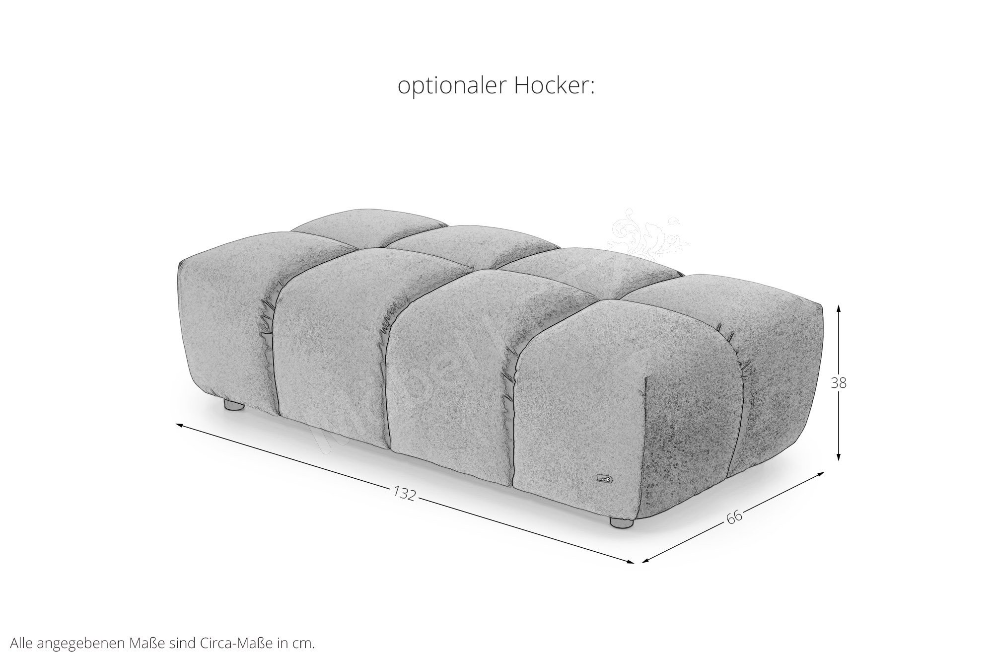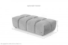 Eine starke, unregelmäßige Faltenbildung stellt keinen Qualitätsmangel dar, sondern ist modellbedingt gewollt und eine warentypische Eigenschaft. Einige Bezüge (Velours, Samt, Viskose) weisen starke Schattierungen auf und changieren je nach Blickrichtung. Das heißt, bei unterschiedlichen Beleuchtungs- sowie Blickwinkeln kommt es zu einem Farbwechsel bzw. zu einer farblichen Veränderung des Bezuges, dies ist eine warentypische Eigenschaft und stellt keinen Beanstandungsgrund dar. Die Anbauteile werden mit Elementverbindern verbunden. Alle Elemente - mit oder ohne Armlehne(n) - sind an allen Seiten sauber verpolstert und können als Abschlussteil, als Zwischenteil und als einzelstehendes Teil verwendet werden. Anbau- und Davorstellhocker unterscheiden sich in der Florrichtung. Gedreht schattieren sie deutlich gegen die anderen Teile.