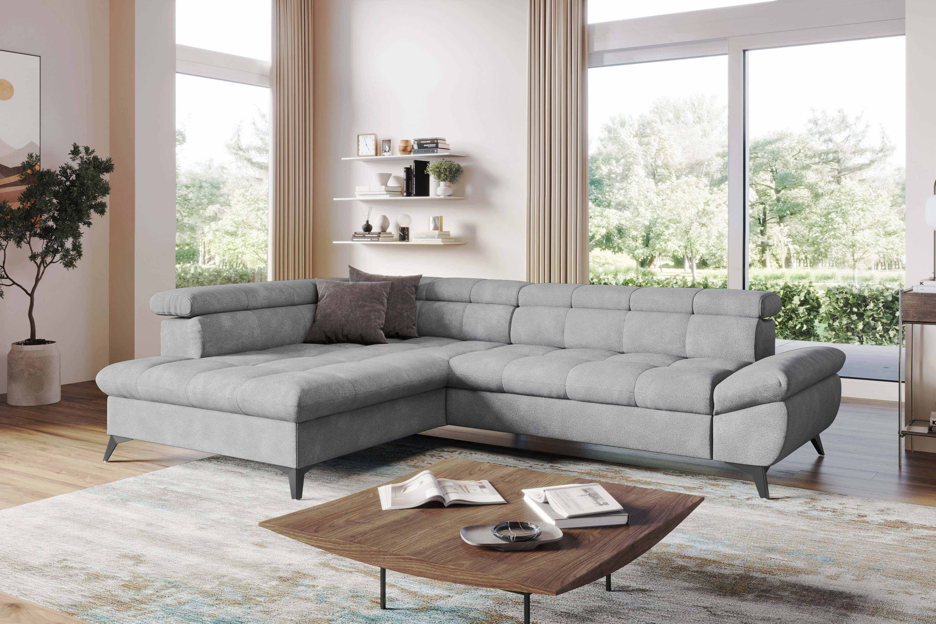 Es gibt doch nichts Schöneres, als nach einem langen Arbeitstag nach Hause zu kommen und sich eine kleine Auszeit zu gönnen. Die ca. 201 x 296 cm große Couchgarnitur Apollo-LE25 aus dem Hause Cotta Polstermöbel, bestehend aus einer Ottomane sowie einem 2,5-Sitzer, schenkt Ihnen einen Ort, wo Sie sich entspannt zurücklehnen und die Beine hochlegen können. Die Polsterung aus Nosagfedern lädt dazu ein, stundenlang in einem guten Buch zu versinken oder eine spannende Serie zu schauen. Bezogen in einem Chenille-Flachgewebe im Farbton "silver" bietet dieses Polstersofa eine moderne Optik und verleiht Ihrem Zuhause eine stilvolle sowie gemütliche Atmosphäre. Tagsüber eine stylische Garnitur, nachts bei Bedarf ein bequemes Nachtlager - dank einer optionalen Schlaffunktion lässt sich dieses Sofa fix in eine Übernachtungsmöglichkeit für Ihre Gäste, mit einer Liegefläche von ca. 216 x 121 cm, verwandeln. Zusätzlich verfügt Apollo-LE25 bereits über eine praktische Kopfteilverstellung, welche bei einer angenehmen Sitzposition unterstützt. Mit einem Klick auf dem Button "Farbe ändern" können Sie aus verschiedenen Stoff- sowie Farbvarianten auswählen und die Eckcouch ganz nach Ihren Bedürfnissen gestalten. Apollo-LE25 von Cotta - überzeugt mit Design, Komfort und Funktionalität.