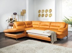 Mit dem Ecksofa Bologna von COTTA Polstermöbel holen Sie sich ein absolutes Highlight ins Haus! Dieses Modell im knalligen, extravaganten Bezug wird Ihnen nicht nur wegen der Optik viele Komplimente einbringen. Das Kunstleder, aber auch die Nahtabsetzungen auf den Sitzflächen sowie die extra tiefen Einzüge in den Rückenkissen verleihen dem Gesamtbild eine elegante Note. Die extra dick gepolsterte Armlehne strahlt dabei zusätzliche Gemütlichkeit aus. Hier kann man sich getrost fallen lassen. Eine weiche Schaumstoffpolsterung, getragen von einer Nosagunterfederung, wird Sie auffangen. Es gibt nichts schöneres, als nach Hause zu kommen, um den anstrengenden Tag gemütlich auf dem Sofa ausklingen zu lassen. Legen Sie die Beine hoch und entspannen Sie sich nach Herzenslust. Nicht immer steht einem der Sinn nach Ruhe und Gelassenheit, dann darf es auch mal der gesellige Abend mit Freunden sein. Mit der optionalen Schlaffunktion können Sie Ihren Besuch nun auch problemlos über Nacht beherbergen. Ihren Gästen steht so dann eine Liegefläche von ca. 191 x 120 cm zur Verfügung. Durch die Auswahl der Schlaffunktion wird die Polsterecke automatisch mit einem kleinen Bettkasten ausgestattet, damit alles griffbereit verstaut ist. Mit dem zusätzlich erhältlichen Hocker schaffen Sie noch einen weiteren Sitzplatz und das Erscheinungsbild ist perfekt abgerundet. Um die Garnitur perfekt an Ihr Wohnambiente anpassen zu können, stellen wir Ihnen eine großzügige Auswahl an verschiedenen Bezügen in den schönsten Farben zur Verfügung. Kreieren Sie unter "Farbe ändern" Ihren neuen Wohnraum-Mittelpunkt und lassen Sie traumhaftes Wohlgefühl bei sich einziehen - mit Bologna von COTTA.