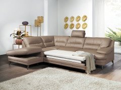 Mit dem Ecksofa Bologna von COTTA Polstermöbel holen Sie sich ein absolutes Highlight ins Haus! Dieses Modell im hellbraunen Bezug wird Ihnen nicht nur wegen der Optik viele Komplimente einbringen. Das Echtleder, aber auch die Nahtabsetzungen auf den Sitzflächen sowie die extra tiefen Einzüge in den Rückenkissen verleihen dem Gesamtbild eine elegante Note. Die extra dick gepolsterte Armlehne strahlt dabei zusätzliche Gemütlichkeit aus. Hier kann man sich getrost fallen lassen. Eine weiche Schaumstoffpolsterung, getragen von einer Nosagunterfederung, wird Sie auffangen. Es gibt nichts schöneres, als nach Hause zu kommen, um den anstrengenden Tag gemütlich auf dem Sofa ausklingen zu lassen. Legen Sie die Beine hoch und entspannen Sie sich nach Herzenslust. Nicht immer steht einem der Sinn nach Ruhe und Gelassenheit, dann darf es auch mal der gesellige Abend mit Freunden sein. Mit der optionalen Schlaffunktion können Sie Ihren Besuch nun auch problemlos über Nacht beherbergen. Ihren Gästen steht so dann eine Liegefläche von ca. 191 x 120 cm zur Verfügung. Durch die Auswahl der Schlaffunktion wird die Polsterecke automatisch mit einem kleinen Bettkasten ausgestattet, damit alles griffbereit verstaut ist. Mit dem zusätzlich erhältlichen Hocker schaffen Sie noch einen weiteren Sitzplatz und das Erscheinungsbild ist perfekt abgerundet. Um die Garnitur perfekt an Ihr Wohnambiente anpassen zu können, stellen wir Ihnen eine großzügige Auswahl an verschiedenen Bezügen in den schönsten Farben zur Verfügung. Kreieren Sie unter "Farbe ändern" Ihren neuen Wohnraum-Mittelpunkt und lassen Sie traumhaftes Wohlgefühl bei sich einziehen - mit Bologna von COTTA.