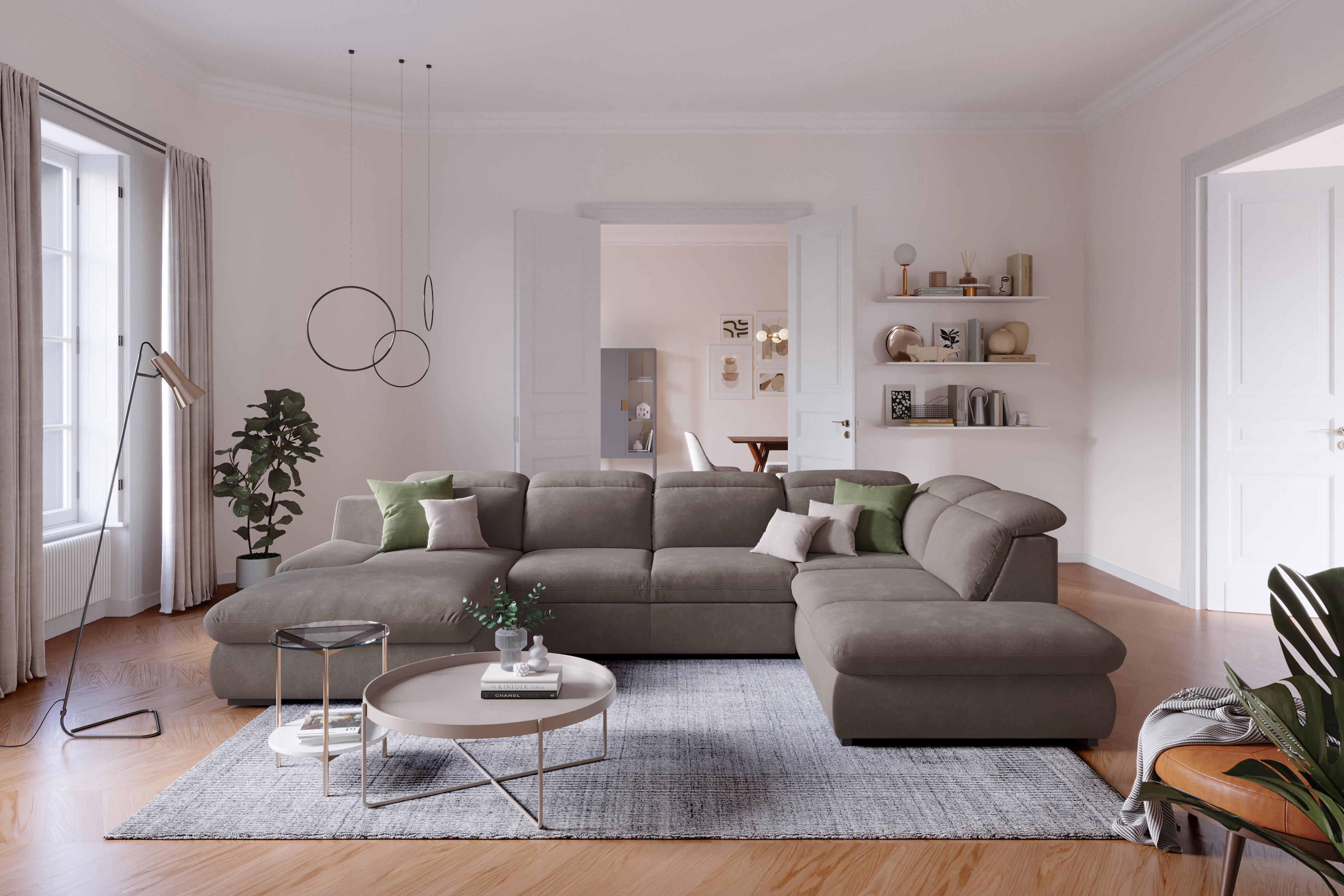 Die Wohnlandschaft Lorena vom Hersteller Cotta Polstermöbel, welche sich in einem Veloursbezug in zeitlosem Braun präsentiert, verzaubert Ihr Zuhause mit einem erfrischenden Design und einem großzügigen Platzangebot. Ob beim Lesen, Serien schauen sowie gemütlichen Beisammensein mit dem Partner, der Familie oder den Freunden - mit einem gigantischen Stellmaß von etwa 168 x 341 x 218 cm wird Ihnen ausreichend Sitzfläche geboten, um sich nach einem anstrengenden Arbeitstag zu entspannen und schöne Momente mit Ihren Liebsten zu erleben. Diese Garnitur überzeugt nicht nur mit ihrer Optik und ihrer Größe, sondern begeistert auch mit praktischen Funktionen: die inklusive Kopfteil- sowie Armteilverstellung unterstützt bei einer angenehmen Sitzhaltung und verleiht der Polstergarnitur den letzten Schliff. Zudem können Sie in den Zusatzoptionen eine ausziehbare Schlaffunktion, welche sich im 2-Sitzer verbirgt, und aufklappbaren Stauraum hinzubuchen. Das XXL-Sofa verfügt dann über eine ca. 258 x 122 cm große Liegefläche, sodass Sie mehr Raum zum Entspannen genießen können. Aus dem Stauraum, welcher sich in der Recamiere sowie in der Ottomane versteckt, lassen sich Decken und Kissen zaubern, perfekt, um für mehr Bequemlichkeit zu sorgen. Mit einem Klick auf "Farbe ändern" erhalten Sie eine vielfältige Übersicht von Stoffen sowie Farben - passen Sie das Bezugskleid von Lorena aus dem Hause Cotta an Ihren Vorstellungen an und machen Sie Ihr Eigenheim zu einer modernen Wohlfühloase.