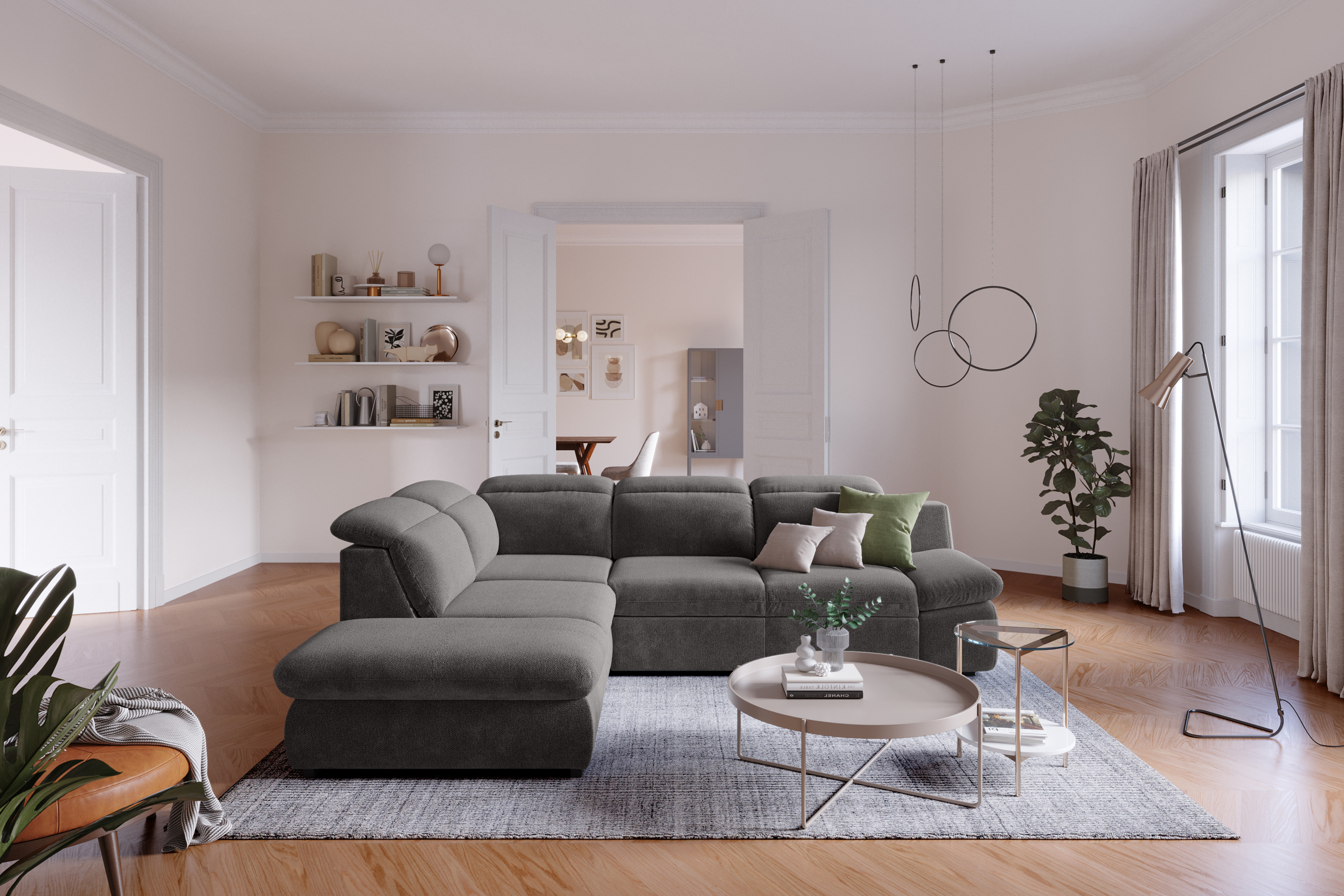 Hier präsentiert sich die Polsterecke Lorena vom Hersteller Cotta Polstermöbel in einem Chenille-Flachgewebe in Dunkelgrau, welches frische Eleganz in Ihr Wohnzimmer bringt und eine harmonische Atmosphäre schafft. Die schwarzen Kunststofffüße tragen nicht nur die Sofaecke, sondern setzen ebenfalls einen eleganten Akzent. Mit einem Stellmaß von ca. 218 x 271 cm, welches aus einer gelungenen Zusammensetzung aus einer Ottomane sowie einem 2-Sitzer resultiert, bietet die Eckcouch ausreichend Entspannungsfläche und wird zu einer echten Wohlfühloase. In unserem Grundangebot ist Lorena mit einer Kopfteil- sowie Armteilverstellung ausgestattet und wird dank der praktischen Funktionen so, zu einem Platz an dem sich Relaxen wie ein Erlebnis anfühlt. Sie haben Besuch, der Abend ist länger geworden und Sie möchten Ihren Gästen einen Schlafplatz anbieten? Dann haben Sie die Möglichkeit, das Ecksofa mit einer Schlaffunktion auszurüsten mit welcher Sie eine großzügige Liegefläche von ca. 189 x 122 cm zaubern können. Sie sind von dieser Eckcouch begeistert aber der Farbton passt nicht zu Ihrer Einrichtung? Unsere Bezugsübersicht, welche Sie bei "Farbe ändern" einsehen können, schenkt Ihnen eine vielfältige Auswahl an verschiedenen Stoffen sowie Farben. Lorena aus dem Hause Cotta - verleiht jedem Raum ein modernes Ambiente und wird garantiert zum Lieblingsort in Ihrem Zuhause.
