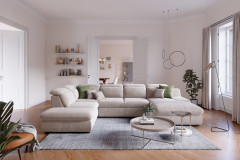 Die Wohnlandschaft Lorena vom Hersteller Cotta Polstermöbel, welche sich in einem Chenille-Flachgewebe in elegantem Beige präsentiert, verzaubert Ihr Zuhause mit einem erfrischenden Design und einem großzügigen Platzangebot. Ob beim Lesen, Serien schauen sowie gemütlichen Beisammensein mit dem Partner, der Familie oder den Freunden - mit einem gigantischen Stellmaß von etwa 218 x 341 x 168 cm wird Ihnen ausreichend Sitzfläche geboten, um sich nach einem anstrengenden Arbeitstag zu entspannen und schöne Momente mit Ihren Liebsten zu erleben. Diese Garnitur überzeugt nicht nur mit ihrer Optik und ihrer Größe, sondern begeistert auch mit praktischen Funktionen: die inklusive Kopfteil- sowie Armteilverstellung unterstützt bei einer angenehmen Sitzhaltung und verleiht der Polstergarnitur den letzten Schliff. Zudem können Sie in den Zusatzoptionen eine ausziehbare Schlaffunktion, welche sich im 2-Sitzer verbirgt, und aufklappbaren Stauraum hinzubuchen. Das XXL-Sofa verfügt dann über eine ca. 258 x 122 cm große Liegefläche, sodass Sie mehr Raum zum Entspannen genießen können. Aus dem Stauraum, welcher sich in der Recamiere sowie in der Ottomane versteckt, lassen sich Decken und Kissen zaubern, perfekt, um für mehr Bequemlichkeit zu sorgen. Mit einem Klick auf "Farbe ändern" erhalten Sie eine vielfältige Übersicht von Stoffen sowie Farben - passen Sie das Bezugskleid von Lorena aus dem Hause Cotta an Ihre Vorstellungen an und machen Sie Ihr Eigenheim zu einer modernen Wohlfühloase.