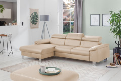 Willkommen Zuhause! Das Modell Micky aus dem Hause Cotta Polstermöbel ist nicht nur ein Möbelstück, es ist ein Ort, an dem Sie sich nach einem hektischen Tag niederlassen und abschalten können. Dieses Ecksofa, welches sich aus einer Recamiere sowie einem 2-Sitzer zusammensetzt, schenkt Ihnen ausreichend Fläche, um sich nach dem Feierabend eine kleine Auszeit zu gönnen und Kraft für den nächsten Tag zu tanken - ob allein oder gemeinsam mit dem Partner. Der beigefarbene Kunstlederbezug, welcher perfekt mit den Metallfüßen harmoniert, verleiht jedem Wohnraum eine außergewöhnliche Note. Eine weitere Besonderheit sind die verstellbaren Kopfteile, die eine angenehme Sitzhaltung ermöglichen, so wird die ca. 166 x 244 cm große Polsterecke schnell zu einem echten Wohlfühlort. In den Zusatzoptionen haben Sie die Möglichkeit, einen passenden Hocker hinzuzubuchen, der eine weitere Sitzgelegenheit bereitstellt oder ideal zum Beinehochlegen ist. Zudem können Sie die Eckgarnitur mit einem Stauraum, in dem sich Kuscheldecken und Lieblingskissen verstauen lassen, sowie mit einer Schlaffunktion ausstatten. Eine Liegefläche von ca. 180 x 126 cm bietet Ihnen oder Ihren Übernachtungsgästen einen großzügigen Platz, um einen erholsamen Schlaf zu genießen und dabei in schöne Träume zu versinken. Nutzen Sie unseren Polsterplaner, um Ihr Traumsofa zu planen, sodass dieses perfekt zu Ihrem Wohnkonzept passt, oder kontaktieren Sie unsere Einrichtungsexperten, die bei der Planung unterstützen. Ob als Einzelsofa, Eckcouch oder große Wohnlandschaft sowie von dezenten bis hin zu knalligen Farbtönen - Micky von Cotta fügt sich in jeden Einrichtungsstil ein.