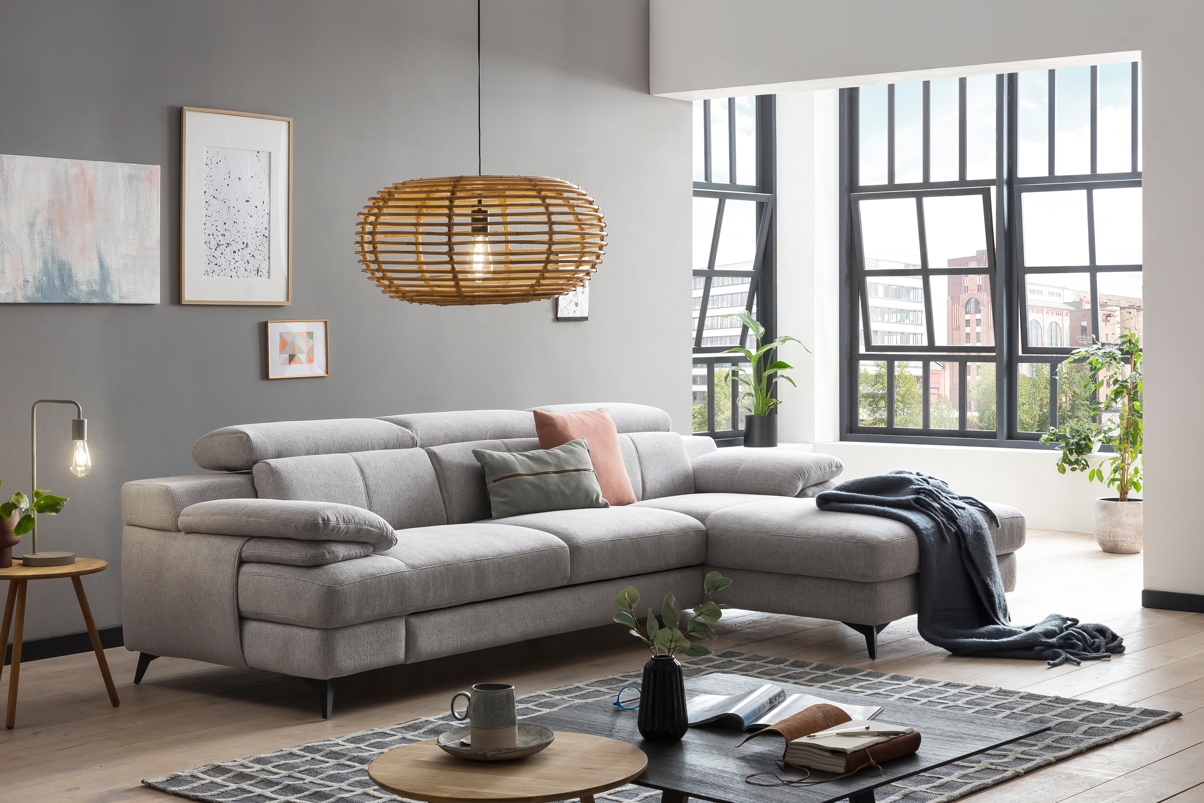 Tür zu, Schuhe aus, rauf aufs Sofa – nach einem anstrengenden Arbeitstag braucht man nichts weiter als den heimischen Lieblingsplatz zum Beinehochlegen und Abschalten. Die moderne Eckgarnitur Titus-LE26 von Cotta, die in einem hellgrauen Chenille-Flachgewebe bezogen ist und auf schwarzen Metallfüßen steht, ist gern Ihr treuer Partner für jegliche Form der Erholung. Bestehend aus einem 3-Sitzer sowie einer Recamiere, welche zusammen ein Stellmaß von ca. 291 x 178 cm ergeben, können Sie sich am Abend ganz Ihrer Lieblingsserie widmen und den Tag nach Ihren Wünschen ausklingen lassen. Eine nosagunterfederte Polsterung liefert dafür den nötigen Sitzkomfort, welcher durch die bereits im Angebot enthaltene Kopfteilverstellung wohltuend verstärkt wird. Gern können Sie sich im weiteren Bestellprozess für eine praktische Schlaffunktion, die eine traumhafte Liegefläche von ca. 215 x 122 cm eröffnet, sowie einen nützlichen Bettkasten entscheiden, welcher alle benötigten Übernachtungsutensilien wie Decken und Kissen gut sortiert für Sie aufbewahrt. Ferner verfügt Titus-LE26 über einen echt bezogenen Rücken und eröffnet Ihnen so die Möglichkeit, Ihre neue Wohlfühloase auf verschiedenste Art sowie Weise im Wohnraum zu platzieren. Sollte der Farbton der Couch nicht Ihren Vorstellungen entsprechen, so können Sie sich unter der Rubrik "Wunschbezug" in Ruhe umsehen – der Hersteller verfügt über eine umfangreiche Stoff- und Bezugskollektion, aus der Sie sicher Ihren persönlichen Favoriten entdecken werden. Definieren Sie Ihre Vorstellung von Komfort neu und kreieren Sie Ihren Wohnraum elegant – mit Titus-LE26 aus dem Hause COTTA Polstermöbel.