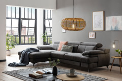 Tür zu, Schuhe aus, rauf aufs Sofa – nach einem anstrengenden Arbeitstag braucht man nichts weiter als den heimischen Lieblingsplatz zum Beinehochlegen und Abschalten. Die moderne Eckgarnitur Titus-LE26 von Cotta, die in einem dunkelgrauen Chenille-Flachgewebe bezogen ist und auf schwarzen Metallfüßen steht, ist gern Ihr treuer Partner für jegliche Form der Erholung. Bestehend aus einer Recamiere sowie einem 3-Sitzer, welche zusammen ein Stellmaß von ca. 178 x 291 cm ergeben, können Sie sich am Abend ganz Ihrer Lieblingsserie widmen und den Tag nach Ihren Wünschen ausklingen lassen. Eine nosagunterfederte Polsterung liefert dafür den nötigen Sitzkomfort, welcher durch die bereits im Angebot enthaltene Kopfteilverstellung wohltuend verstärkt wird. Gern können Sie sich im weiteren Bestellprozess für eine praktische Schlaffunktion, die eine traumhafte Liegefläche von ca. 215 x 122 cm eröffnet, sowie einen nützlichen Bettkasten entscheiden, welcher alle benötigten Übernachtungsutensilien wie Decken und Kissen gut sortiert für Sie aufbewahrt. Ferner verfügt Titus-LE26 über einen echt bezogenen Rücken und eröffnet Ihnen so die Möglichkeit, Ihre neue Wohlfühloase auf verschiedenste Art sowie Weise im Wohnraum zu platzieren. Sollte der Farbton der Couch nicht Ihren Vorstellungen entsprechen, so können Sie sich unter der Rubrik "Wunschbezug" in Ruhe umsehen – der Hersteller verfügt über eine umfangreiche Stoff- und Bezugskollektion, aus der Sie sicher Ihren persönlichen Favoriten entdecken werden. Definieren Sie Ihre Vorstellung von Komfort neu und kreieren Sie Ihren Wohnraum elegant – mit Titus-LE26 aus dem Hause COTTA Polstermöbel.