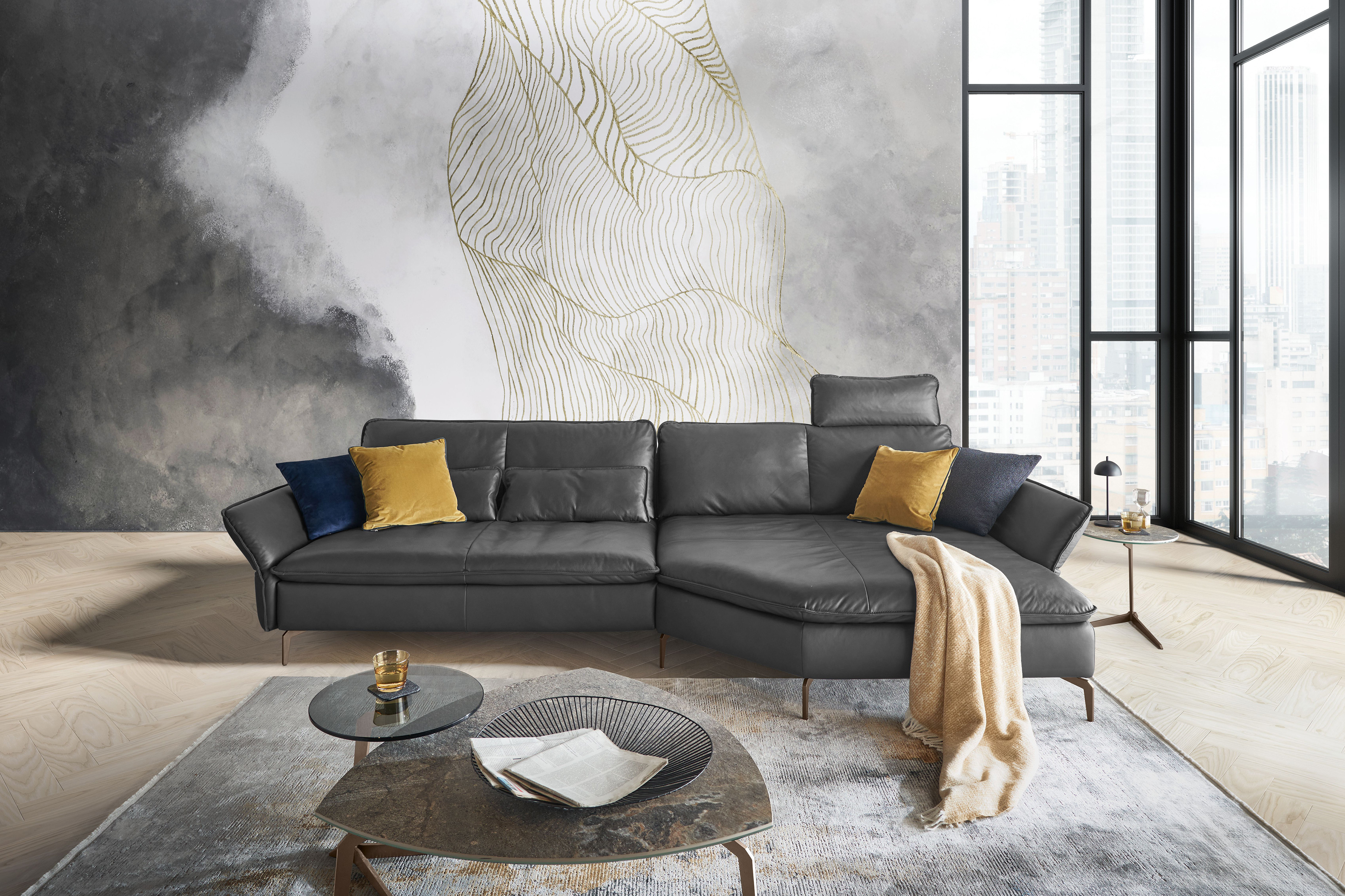 Mit der Eckgarnitur MR 2340 von Musterring erhalten Sie ein Möbelstück, welches Ihr Zuhause mit modernem Look, großzügiger Sitzfläche sowie einer hochwertigen Polsterung bereichert. Sie sind geschafft vom Tag und sehnen sich nach einer kleinen Auszeit? Dann nehmen Sie Platz auf der ca. 338 x 160 cm großen Couchgarnitur, welche mit ihrer ergo-PUR-Schaum gepolsterten Sitzfläche, getragen von dauerelastischen Wellenfedern, für ein herrliches Sitzerlebnis sorgt, und genießen Sie gemütliche Stunden mit einem guten Buch oder einer spannenden Serie. In unserem zauberhaften Angebot präsentiert sich das Schmuckstück mit einem dunkelgrauen Ledergewand sowie mit bronzefarbenen Metallfüßen. Diese Farbkombination harmoniert nicht nur perfekt miteinander, sondern wird zu einem stilvollen Highlight und verleiht jedem Wohnraum einen eleganten sowie einzigartigen Charme. Aber auch in puncto Funktion kann das Musterring Sofa überzeugen: Die im 2-Sitzer enthaltene Sitztiefenverstellung, ermöglicht durch das Zurücksetzen der Rückenlehne, die Sitztiefe von etwa 63 cm auf ca. 81 cm zu erweitern. Ideal für ein aufrechtes Sitzen beim Lesen oder ein entspanntes Zurücklehnen. Außerdem lässt sich MR 2340 mit einer Seitenteilverstellung ausstatten, sodass Sie die Armlehnen auf Ihre gewünschte Position stufenweise anpassen können. Über die Zusatzoptionen haben Sie die Möglichkeit, diese sowie auch Kopfstützen hinzuzubuchen oder aus verschiedenen Fußvarianten auszuwählen. Zudem finden Sie darüber hinaus Kissen, welche das Gesamtbild optimal ergänzen und den Wohlfühlfaktor erhöhen. Sie sind begeistert, aber das Äußere passt nicht zu Ihrem bestehenden Wohnkonzept? Kein Problem! Mit einem Klick auf "Farbe ändern" haben Sie die Wahl, zwischen dezenten oder kräftigen Farbnuancen sowie verschiedenen Bezugsmaterialien. Für noch mehr Gestaltungsfreiheit steht Ihnen der Polsterplaner zur Verfügung. So können Sie aus diversen Elementen auswählen und Ihr Traumsofa nach Ihrer Einrichtung sowie Ihrem Platzangebot konfigurieren. Setzen Sie ein Design-Statement und erleben Sie erholsame Momente mit der Polstergarnitur MR 2340 von Musterring.