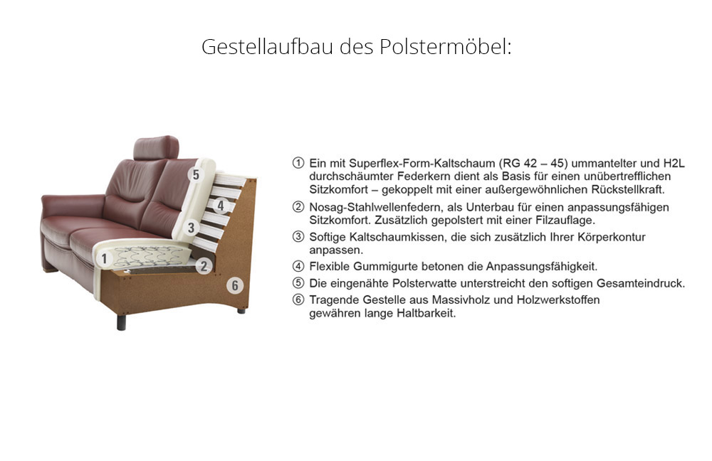- Sitz: H2L - mit Superflex-Form-Kaltschaum ummantelter und voll durchgeschäumter Federkern auf Nosag-Stahlwellenfedern