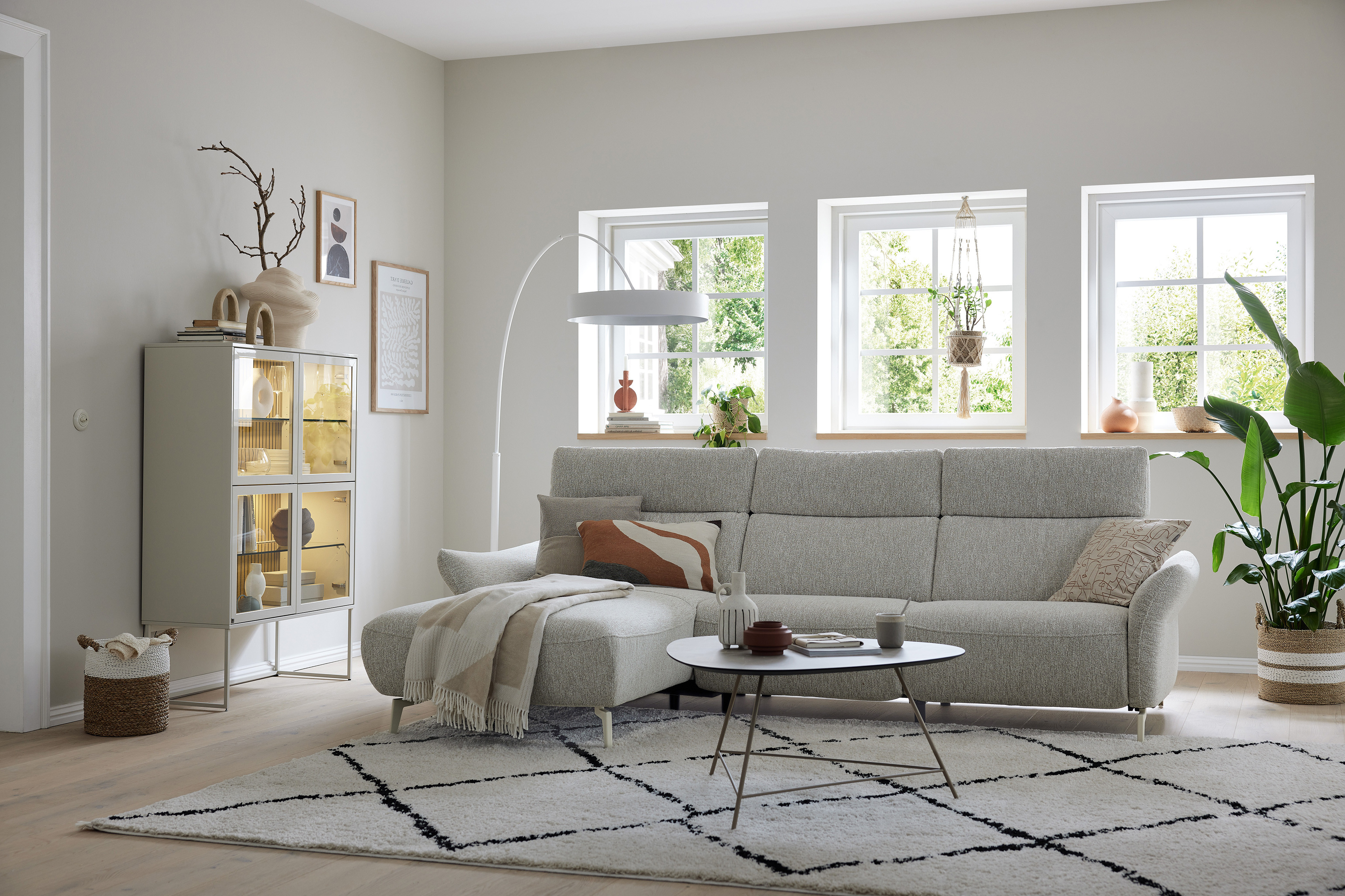 In stilsicherer Optik und mit einem Hauch Arroganz gestaltet die Eckgarnitur MR 280 von Musterring durch ihre reine Präsenz jeden Raum zu einem Ort, an dem Chic, Glamour sowie Ästhetik die Oberhand gewinnen. Sowohl der cremefarbene Stoffbezug als auch die dazu passende Fußausführung lassen dieses markant designte Ecksofa in absoluter Eleganz erstrahlen. Zusammengesetzt aus einem Canape sowie einem 2,5-Sitzer, bringt das Modell bereits eine manuelle Kopfteilverstellung in seine neue Wirkungsstätte mit. Neben diesen behaglichen Komfort-Extra können Sie über unsere Zusatzoptionen ebenfalls den Härtegrad des Sitzes aus drei verschiedenen Optionen frei wählen, um Ihr neues Sofa ganz und gar auf Ihre Bedürfnisse abzustimmen. Ihnen gefällt die inkludierte Kopfteilverstellung, jedoch steht Ihnen ab und an der Sinn danach, sich entspannt zurückzulehnen? Dann wird Sie die hinzubuchbare WallAway-Funktion sicherlich begeistern. Über die seitlich im Sitz liegenden Touch-Buttons können Sie den Neigungswinkel der Rückenlehne ganz nach Belieben einstellen und sich sowohl in Ihre Wunschposition fallen als auch die Seele baumeln lassen. Ob in Stoff oder Leder, mit dekorativen Zierkissen oder ohne jegliche Ablenkung vom eigentlichen Erscheinungsbild - mit der Polstergarnitur MR 280 von Musterring werden Lifestyle, Moderne und absolute Gemütlichkeit Einzug in Ihre vier Wände halten. Zögern Sie also nicht und bestellen Sie diese hinreißende Schönheit noch heute!