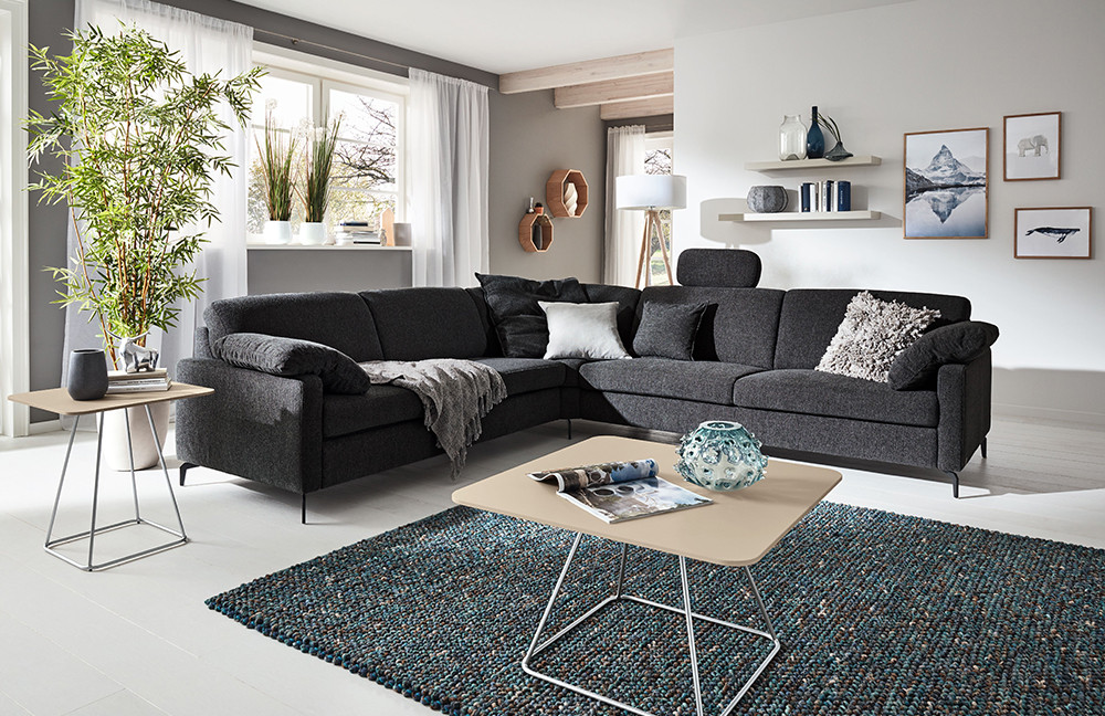 Ein Sofa ist nicht nur ein Möbelstück, es ist das Herz des Zuhauses, ein Ort, an dem man sich nach einem langen Tag fallen lassen sowie abschalten kann, Gedanken und Seele ruhen sowie neue Gespräche mit den Liebsten entstehen. Mit dem Ecksofa MR 2875 von Musterring wird Ihnen genau so ein Platz geschenkt, welcher mit einer Stellfläche von etwa 266 x 286 cm und einer hochwertigen Sitzpolsterung aus Polyätherschaum mit eingearbeitetem Federkern, die auf dauerelastischen Wellenfedern ruht, die perfekte Ruheoase bietet. Mit ihrer großzügigen Fläche sowie dem unvergleichlichen Komfort verwandelt die Garnitur jeden Moment in ein sinnliches Erlebnis und schafft eine zauberhafte, einladende Wohlfühlatmosphäre. Zudem kann MR 2875 auch mit ihrer zeitlosen Optik begeistern: Das Chenille-Flachgewebe in Anthrazit entfaltet dezenten Glanz, verleiht der Polsterecke eine luxuriöse, dennoch zurückhaltende Raffinesse und fügt sich optimal in jedes Interieur ein. Unter dem Menüpunkt "Wunschbezug - Farbe ändern" erhalten Sie eine vielfältige Stoff- sowie Lederübersicht mit vielen kräftigen oder schlichten Farbtönen, sodass Sie das Gewand auch an Ihre Vorstellungen anpassen können. Zudem lässt sich das Ecksofa ideal mit kuscheligen Kissen, praktischen Kopfstützen sowie einem Hocker in verschiedenen Größen komplettieren. Diese sind ganz einfach über der Rubrik "Zusatzoptionen" hinzubuchbar. Darüber hinaus finden Sie dort eine große Auswahl an diversen Seitenteilen, Fußvarianten, zwei wählbaren Sitz- und Rückenhöhen, Sitztiefen sowie drei Polsterungen. Ob eine andere Eckcouch, eine große Wohnlandschaft oder eine 3-2-1 Sofagruppe - mit unserem Polsterplaner haben Sie die Möglichkeit, Ihre Wunschgarnitur zu konfigurieren. Die Musterring Couch MR 2875 ist die ideale Wahl für alle, die stilvolles Design lieben und Bequemlichkeit schätzen.
