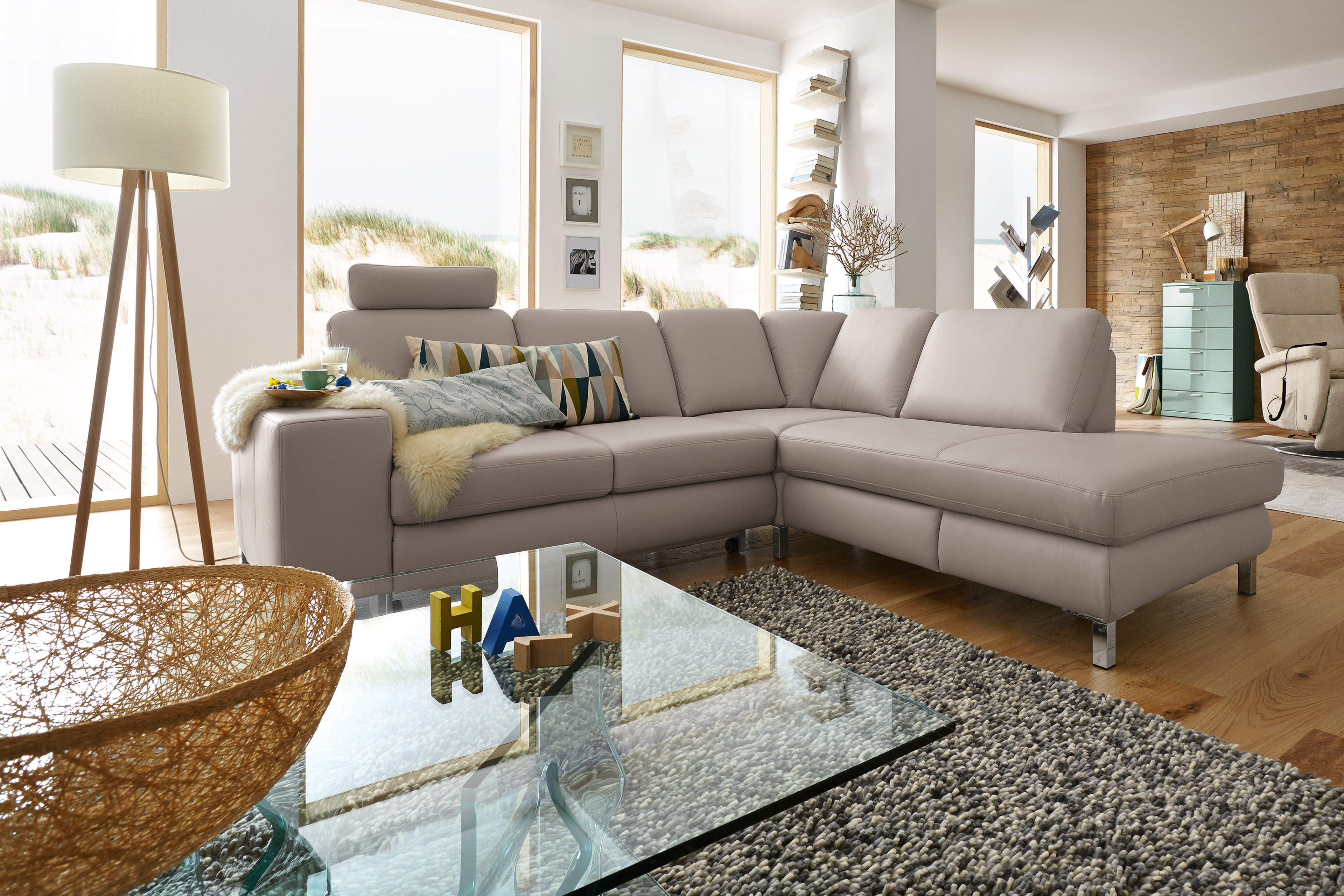 Bequemes Sitzen leicht gemacht – mit der Musterring Eckgarnitur MR 365. Einmal mehr wird hier ein Modell präsentiert, welches dank der wählbaren Sitzpolsterung aus einem PUR-Schaum oder einem Federkern nicht nur den passenden Sitzkomfort mit sich bringt, sondern ebenfalls für die richtige Portion Gemütlichkeit an jedem einzelnen Tag sorgen wird. Genießen Sie neben dem angenehmen Sitzgefühl auch eine ansprechende Optik, hervorgerufen durch den wunderbaren Echtlederbezug sowie die dazu stimmigen glänzenden Metallfüße. Doch das puristisch designte Möbelstück macht nicht nur im Ledergewand eine gute Figur. Nehmen Sie sich einen Moment Zeit und werfen Sie einen Blick in die vielfältige Bezugsübersicht unter dem Menüpunkt “Wunschbezug“. Hier wird selbst der größte Kritiker fündig und erschafft sich die ideale Polstergarnitur, abgestimmt auf seinen Geschmack und so gut wie jeden Einrichtungsstil. Sie erwarten mehr von einer Eckcouch als ein ansprechendes Äußeres und Gemütlichkeit? Kein Problem, den MR 365 kann auf Wunsch mit einer Schlaffunktion sowie einem Schubkasten ausgestattet werden. Somit erhalten Sie mehr Platz zum Relaxen und einen kleinen Stauraum, in welchem Ihre Lieblingsdecke perfekt aufgehoben ist. Weiterhin kann unser Angebot mit einem Hocker oder einer Hockerbank erweitert werden – ebenso besteht die Möglichkeit, variabel einsteckbare Kopfstützen, die Sie in gewünschter Anzahl direkt über unsere Zusatzoptionen zum Angebot hinzubuchen können, zu erwerben. Gestalten Sie Ihr Wohnzimmer mit der Polsterecke MR 365 von Musterring zu einem Ort der Harmonie sowie des Wohlgefühls, an dem gern verweilt und Entspannung großgeschrieben wird.