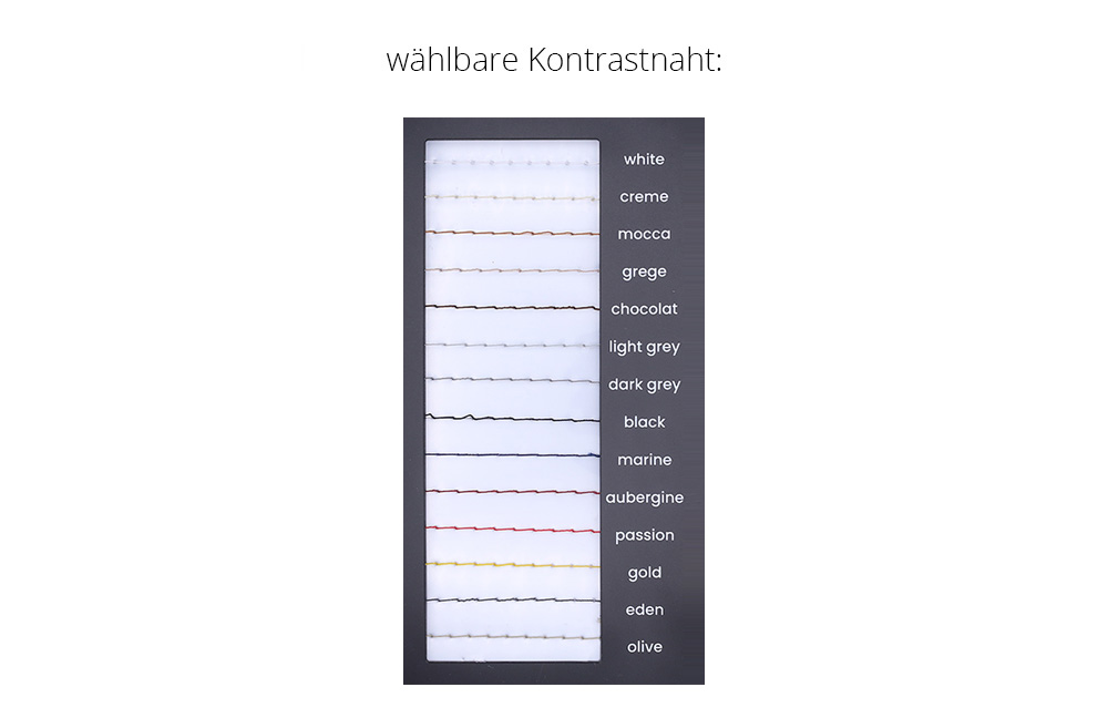 Bei einer zweifarbigen Ausführung ist eine Kontrastnaht nur auf dem Hauptbezug möglich.