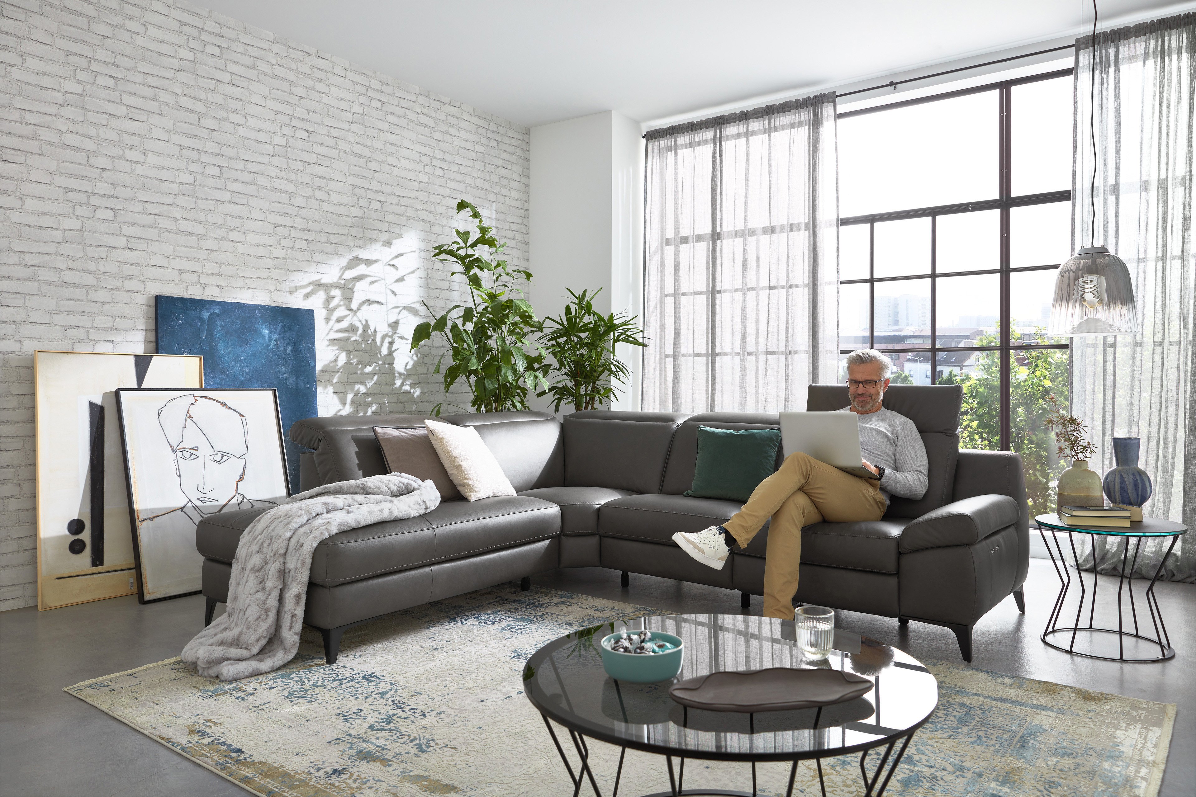 In diesem Angebot stellen wir Ihnen das elegante Musterring Sofa MR 9120 vor, welches nicht nur mit seiner zeitlosen Optik und seiner großzügigen Sitzfläche alle Blicke auf sich zieht, sondern auch beim Platznehmen mit einem himmlischen Komfort überzeugt. Dieses Möbelstück wird mit einem Platzangebot von etwa 240 x 280 cm zur einladenden Wohlfühloase, auf der Sie nach einem ereignisreichen Tag perfekt abschalten und eine behagliche Auszeit mit Ihrem Lieblingsroman oder einer spannenden Fernsehsendung genießen können. Weich und zugleich stützend - die sorgfältig abgestimmte Polsterung aus einem HR-Kaltschaum sorgt nicht nur für ein ausgezeichnetes Sitzerlebnis, sondern vermittelt ein Gefühl von Stabilität sowie Geborgenheit. Aber auch mit seinem attraktiven Design punktet dieses Sitzmöbel. Während das graue Lederoutfit dem Ecksofa eine luxuriöse Ausstrahlung verleiht sowie Eleganz versprüht, setzen die schwarzen Metallfüße einen dezenten, modernen Kontrast und runden das Gesamtbild stilvoll ab. Ein absolutes Highlight ist die Armteilverstellung, welche eine gemütliche Liegeposition ermöglicht, sowie die manuelle Kopfteilverstellung, die optimalen Halt für Nacken und Schultern bietet. Optional lässt sich das Schmuckstück mit einer motorischen Relaxfunktion ausstatten. Per Knopfdruck senkt sich in Sekundenschnelle die Rückenlehne und die Fußstütze fährt hoch. So entsteht eine komfortable Ruhezone, in der einem Mittagsschläfchen nichts mehr im Wege steht. Diese sowie einen zusätzlichen Hocker, verschiedene Fußvarianten, Polsterungen, Sitzhöhen sowie eine weitere Armlehnenausführung finden Sie unter den Zusatzoptionen. Außerdem lässt sich mit einem Klick auf "Farbe ändern" das Gewand des Modells anpassen. Ob in einem schlichten, modernen Leder- oder lebendigen, ausdrucksstarken Stoffbezug: Wählen Sie dank der breiten Auswahl an diversen Materialien und Farbnuancen Ihren persönlichen Favoriten. MR 9120 von Musterring ist ein Ort zum Relaxen, Lachen und Träumen.
