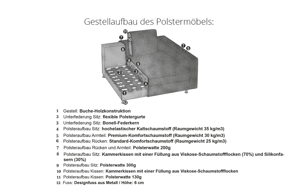 - Sitz: hochelastischer Kaltschaumstoff, Bonell-Federkern, Kammerkissen mit einer Füllung aus Viskose-Schaumstoffflocken und Silikonfasern, flexible Polstergurte