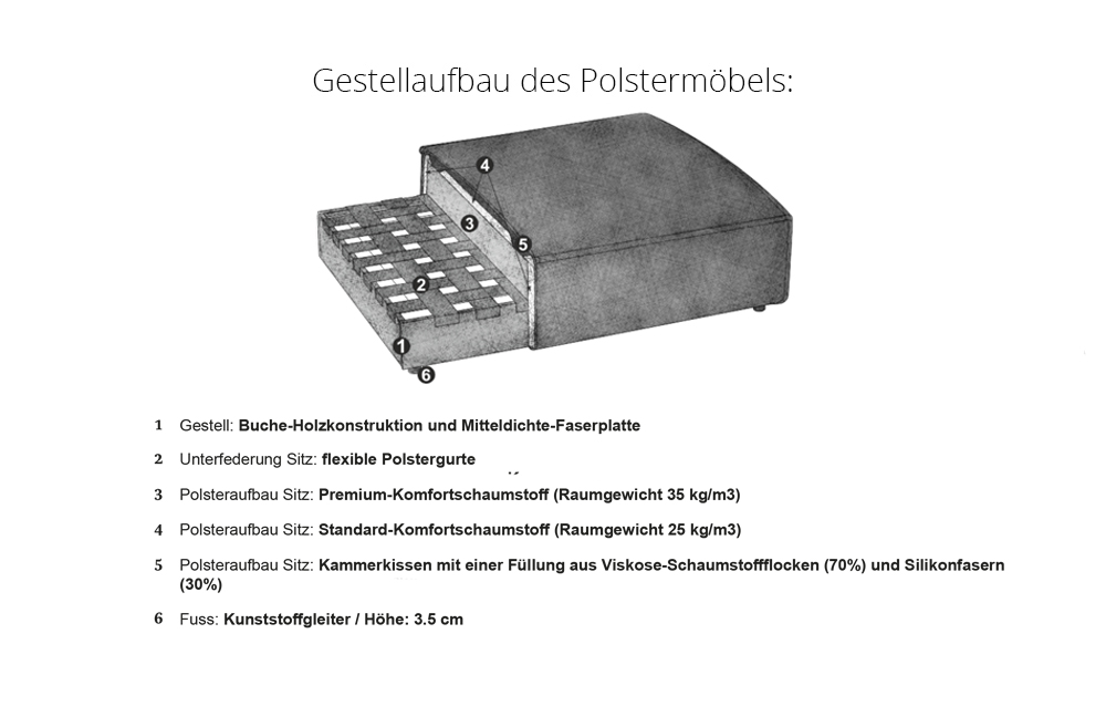 - Sitz-/Lehnen-Elemente: Premium-Komfortschaumstoff, Standard-Komfortschaumstoff, Kammerkissen mit einer Füllung aus Viskose-Schaumstoffflocken und Silikonfasern, flexible Polstergurte