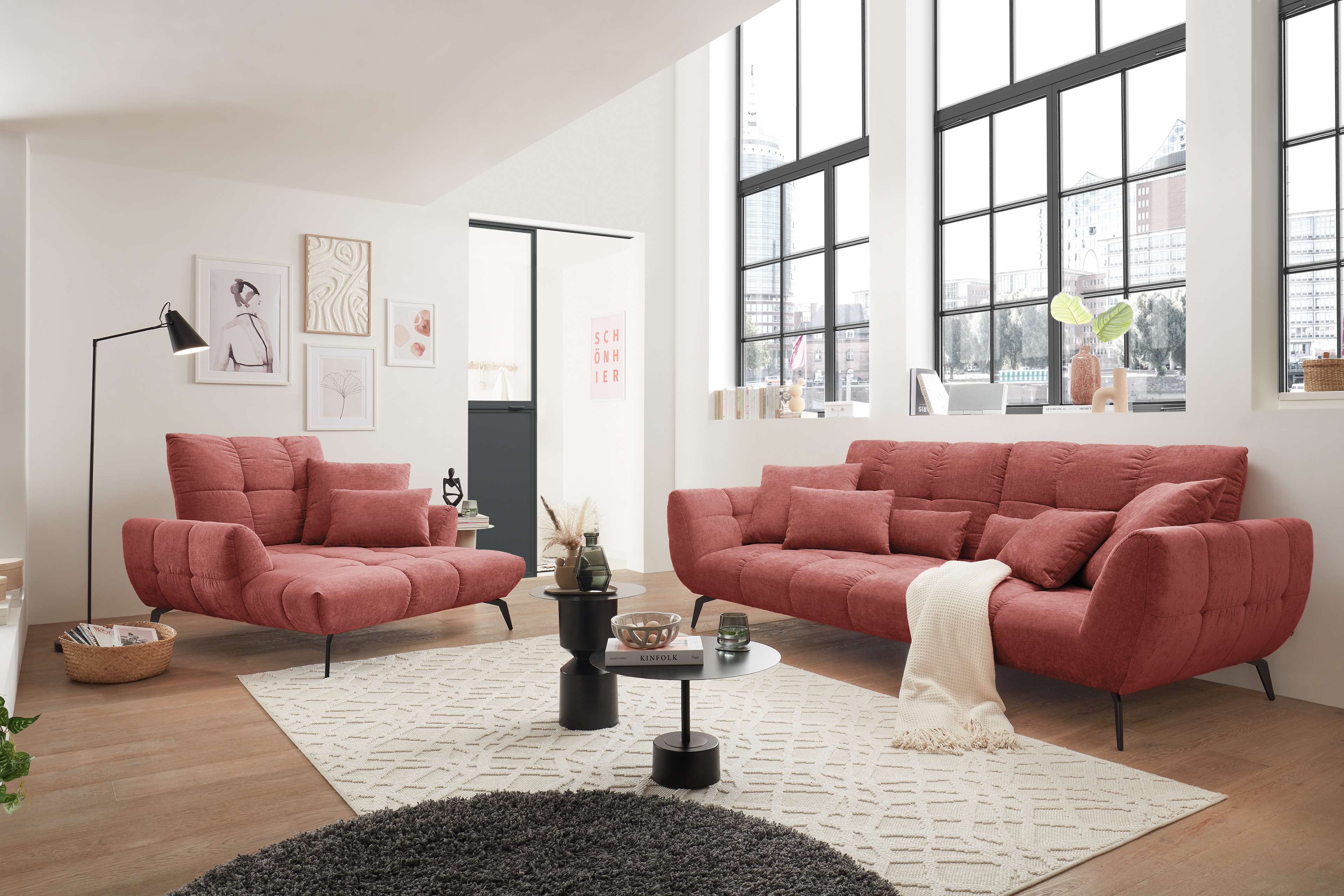 Das Megasofa Malibu-LE26 von set one by Musterring bringt mit seinem ausdrucksstarken Rotton Lebendigkeit sowie Eleganz in Ihr Wohnambiente. Die warme Farbnuance verleiht dem Raum eine behagliche Ausstrahlung und schafft ein harmonisches Zusammenspiel aus Modernität sowie Gemütlichkeit. So entsteht ein Ort, der gleichermaßen Ruhe spendet und darüber hinaus auch wunderbar zum längeren Verweilen einlädt. Das hochwertige Chenille-Flachgewebe überzeugt nicht nur optisch, sondern fühlt sich auch angenehm weich an. Die bequeme Polsterung sorgt für ein entspanntes Sitz- sowie Liegegefühl - perfekt für gemütliche Abende, ruhige Stunden mit einem guten Buch in der Hand oder gesellige Runden mit der Familie. Die großzügige Sitzfläche mit einer Breite von ca. 260 cm bietet Ihnen ausreichend Platz zum Zurücklehnen, Wohlfühlen oder einfach zum Abschalten vom Alltag. Durch flexible Funktionen, die Sie optional hinzubuchen können, lässt sich das Polstersofa individuell anpassen und bietet Ihnen so maximalen Komfort in jeder Situation. So kann beispielsweise eine verstellbare Sitztiefenverstellung oder eine Rückenneigungsfunktion für zusätzlichen Sitzkomfort sorgen und aus dem Einzelsofa wird im Handumdrehen ihr persönlicher Rückzugsort. Das moderne Design wird durch den charakteristischen Farbton stilvoll ergänzt und setzt gezielte Akzente im Raum, ohne sich in den Vordergrund zu drängen. So fügt sich das Megasofa mühelos in verschiedene Einrichtungsstile ein - von modern bis gemütlich-elegant. Wahlweise lässt sich der 2-Sitzer mit einem stilvollen Loveseat, einem praktischen Hocker sowie passenden Zierkissen ergänzen, um das Wohnkonzept perfekt abzurunden. Ein Bigsofa, das Design, Komfort sowie Wohnlichkeit auf harmonische Weise verbindet und Ihrem Zuhause eine besondere Note verleiht - das set one by Musterring Sofa Malibu-LE26.