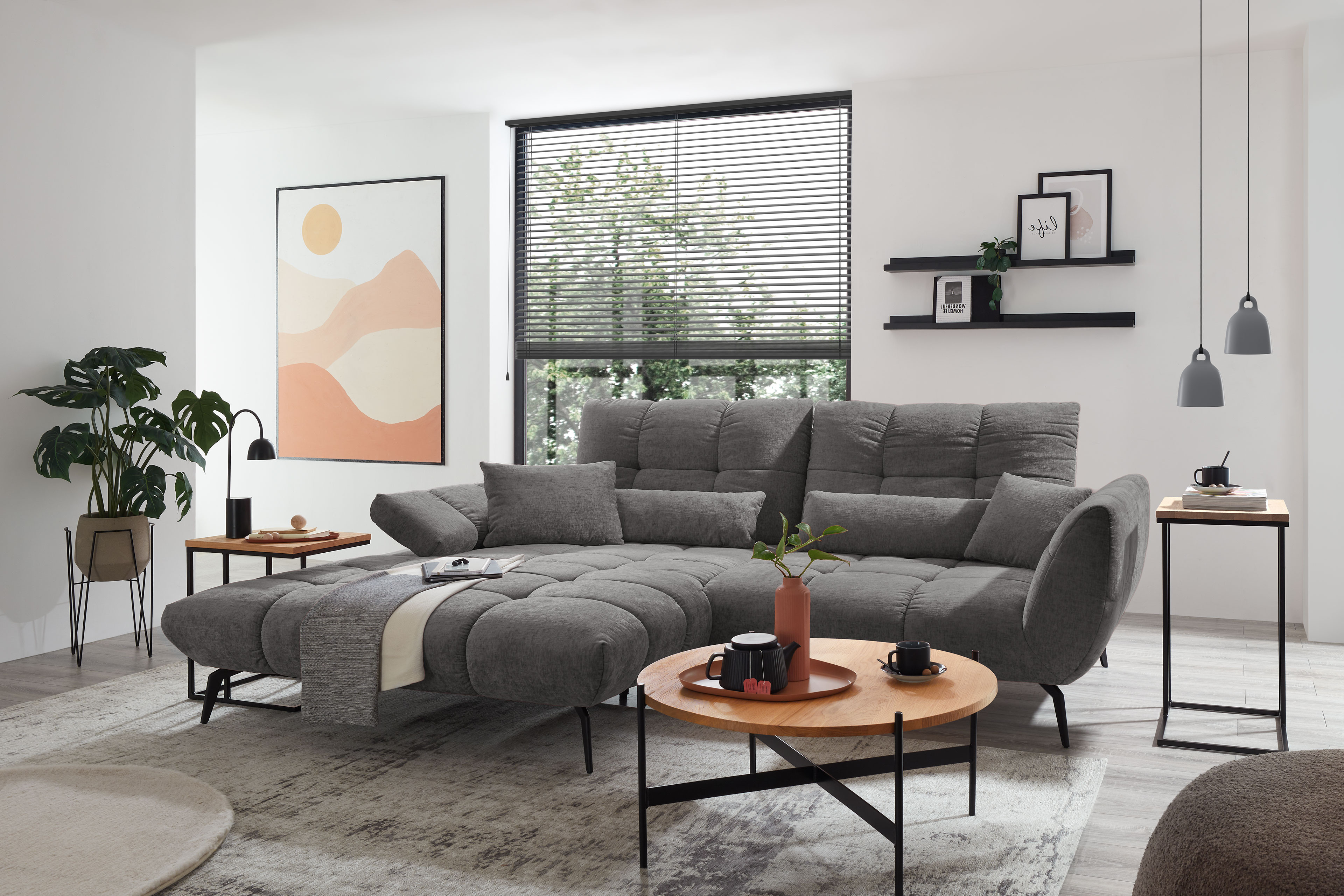 Modernes Design trifft auf einladende Großzügigkeit - so zeigt sich die Sofaecke namens Malibu-LE26 von set one by Musterring und wird zum zentralen Blickfang in Ihrem Wohnzimmer. Das anschmiegsame Chenille-Flachgewebe im edlen Grauton verleiht dem Möbelstück eine zeitlose Ausstrahlung und bringt Eleganz in jeden Raum, während die fein gesteppte Polsterung von Sitz sowie Rücken für eine ausdrucksstarke, ästhetische Optik sorgt. So entsteht ein Wohngefühl, das gleichermaßen stilvoll wie auch entspannt wirkt. Auf einem Stellmaß von ca. 191 x 273 cm bietet Ihnen das Ecksofa reichlich Platz zum Zurücklehnen, Ausstrecken und Genießen. Die angenehm abgestimmte Polsterung sorgt dabei für ein komfortables Sitzgefühl, das sowohl im Alltag als auch bei besonderen Momenten überzeugt. Hochwertige Materialien und eine sorgfältige Verarbeitung garantieren Langlebigkeit sowie ein dauerhaft schönes Erscheinungsbild. Dank durchdachter Funktionen lässt sich die Polstergarnitur flexibel an Ihre individuellen Bedürfnisse anpassen. Neben der integrierten Sitztiefenverstellung steht Ihnen auf Wunsch auch eine Rückenneigungsverstellung zur Verfügung. Aus zwei unterschiedlichen Armteilausführungen, wobei die Variante Typ A sogar mit Rasterbeschlag gewählt werden kann, mit der sich der Neigungswinkel flexibel regulieren lässt, wählen Sie Ihren bevorzugten Favoriten. Schaffen Sie mit den Zusatzfunktionen ein Höchstmaß an Komfort - vom aufrechten Sitzen bis zum entspannten Liegen - das set one by Musterring Sofa passt sich so jeder Situation mühelos an. Passend zur Polsterecke bietet die Serie als Ergänzung einen Hocker und auch Zier- sowie Nierenkissen sind erhältlich, um das Wohnkonzept stimmig zu vervollständigen. Mit seiner attraktiven Farbgebung verleiht Malibu-LE26 dem Raum eine wohnliche und einladende Atmosphäre. Alternativ stehen über die Zusatzoptionen weitere Farben sowie Bezugsstoffe zur Auswahl. Warten Sie nicht länger, erfüllen Sie sich Ihren Wohntraum und genießen Sie jeden Moment auf dem Sofa, das Komfort sowie Stil perfekt vereint.