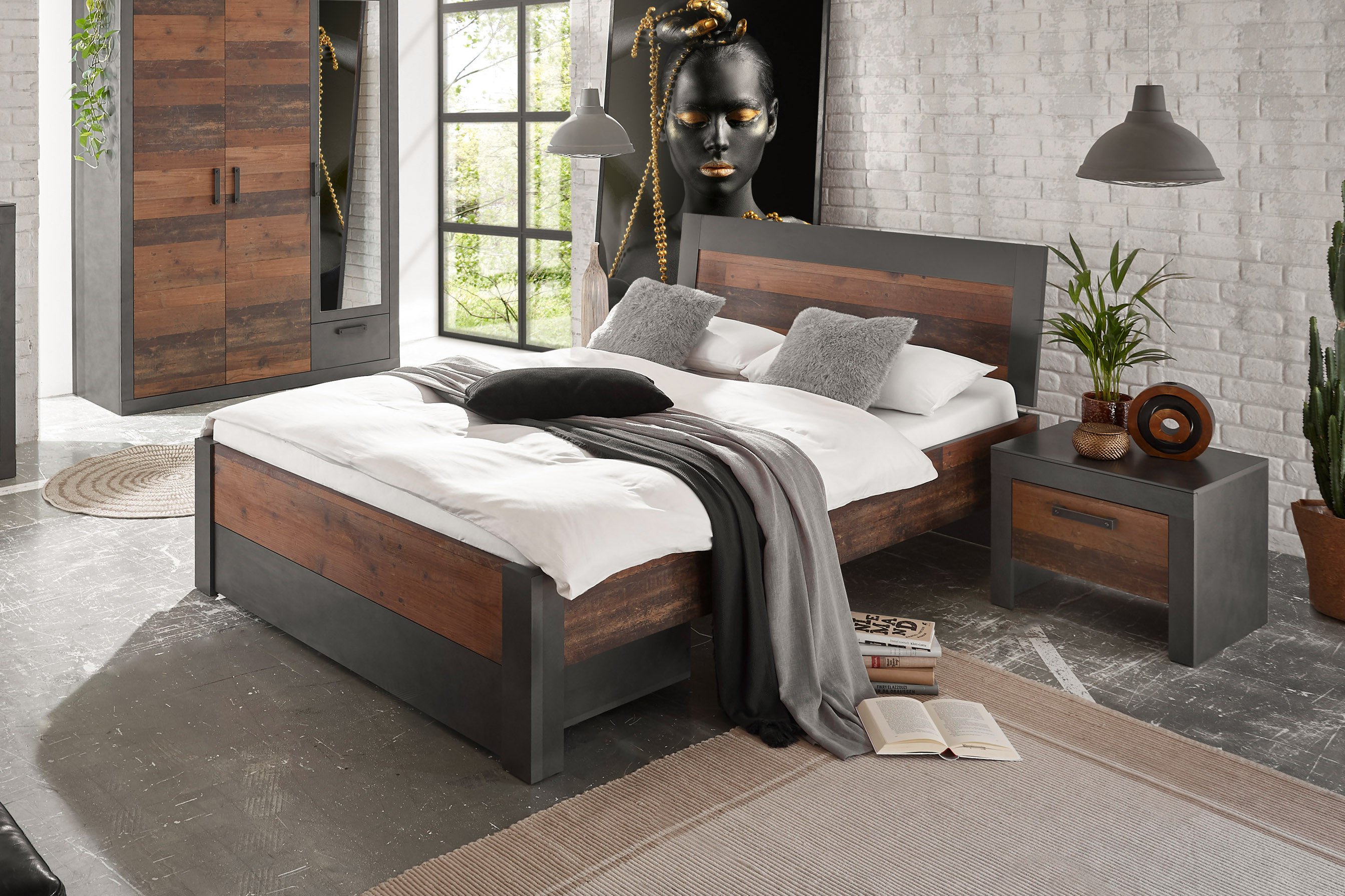 Brooklyn von Kollektion Letz ist ein Möbelprogramm in modernem, leicht industrial angehauchtem Stil für Ihr Zuhause. Der dunkelgraue Matera-Farbton geht hier eine Kombination mit einem intensiven Holz-Mix ein, bei welchem es sich um eine ressourcenschonende sowie erschwingliche Nachbildung handelt. Im vorliegenden Angebot präsentieren wir Ihnen ein Bett mitsamt Kopfteil und einer Liegefläche von 140 x 200 cm. Das geräumige Möbelstück lässt sich sowohl als Einzelbett als auch als Doppelbett nutzen. Dementsprechend haben Sie hier auch die Wahl, eine oder zwei Nachtkonsolen direkt mit dazuzubuchen, um so Ihren neuen Schlafplatz zu komplettieren. Ein Bettkasten für das Fußende, welcher den Freiraum unterhalb des Bettes in praktischen Stauraum verwandelt, lässt sich ebenfalls gleich mitbestellen. Beides finden Sie hier auf dieser Seite in unseren Zusatzoptionen. Suchen Sie noch weitere passende Schlafzimmermöbel aus dieser Kollektion Letz Kollektion? Mit unserem übersichtlichen Modellkonfigurator können Sie sich aus allen verfügbaren Elementen Ihr Wunsch-Schlafzimmer zusammenstellen.