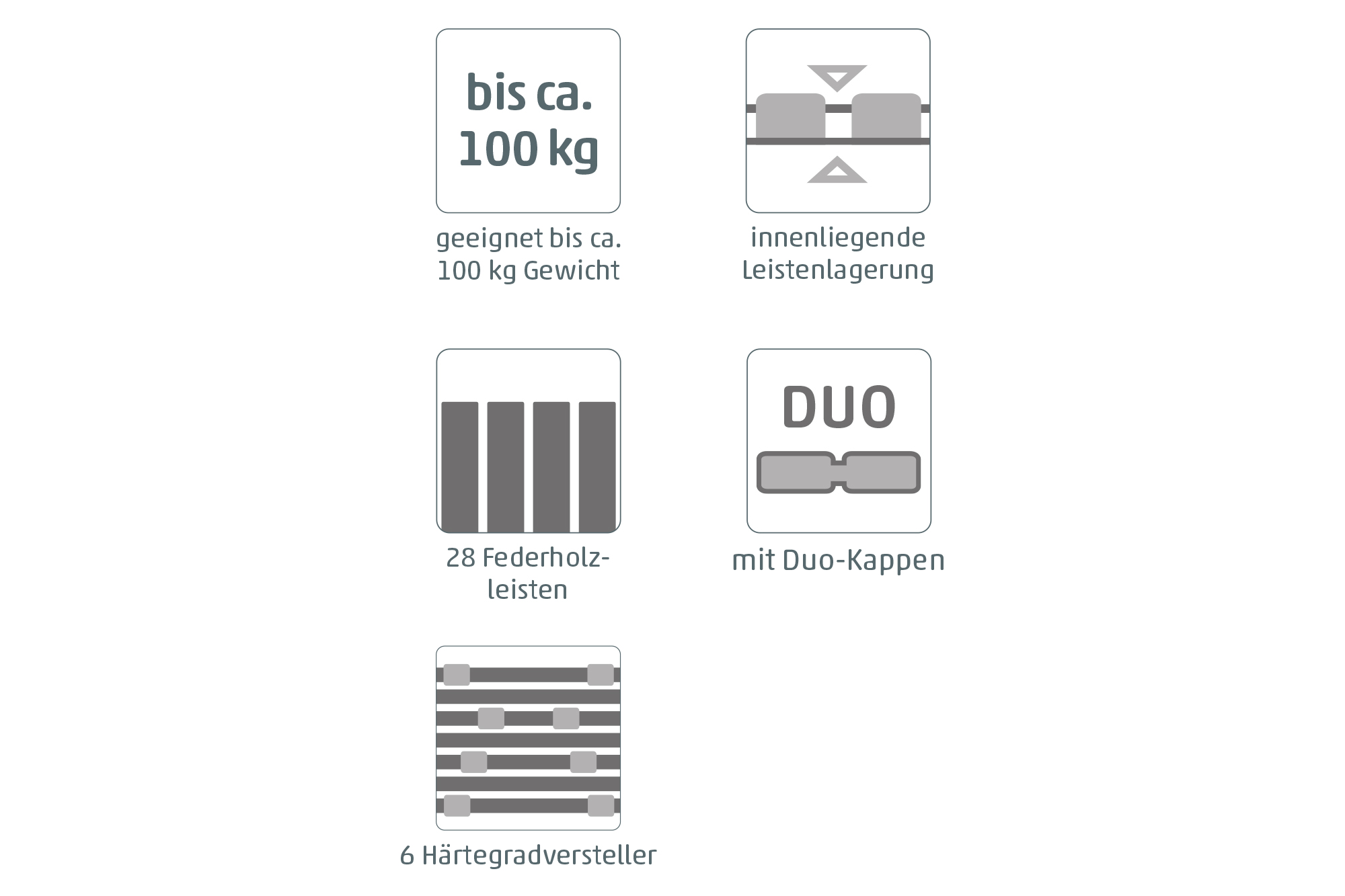 - Federleisten: 28 innenliegend gelagerte Leisten in Duo-Kappen mit 5 Liegezonen, davon 6 Doppelleisten im Mittelbereich mit Härtegradverstellung, Mittelgurt für gleichmäßige Druckverteilung
