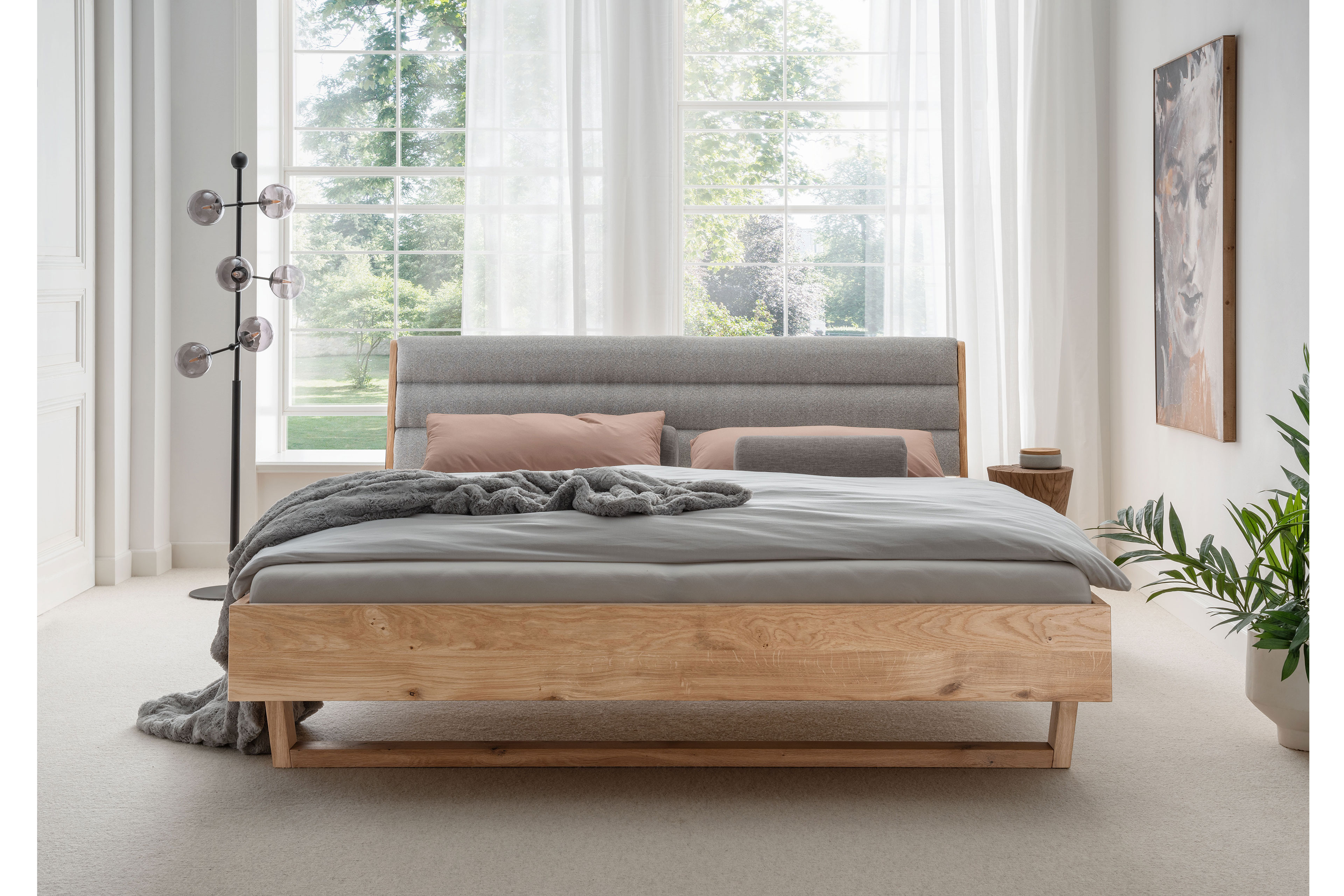 Mit seinem Charme und einer natürlichen Optik versehen, wickelt das Massivholzbett jeden um den Finger. Das Möbelstück von GK Möbelvertrieb schafft es auf raffinierte Weise, die sanfte Weichheit und geschmeidige Eleganz mit robuster Massivität und stabiler Stärke zu vereinen. Die Serie BE-0825 zeigt, wie gut sich ein puristisches Design mit unterschiedlichen Versionen eines Kopfteils kombinieren lässt. Der Bettrahmen und die Holzkufe sind dabei immer aus massivem Wildeichenholz gefertigt, unser Angebot wird außerdem begleitet von einem bequemen, hellgrauen Polsterkopfteil. Sie möchten gern eine andere Liegefläche als die vorgegebene von 140 x 200 cm auswählen? Dann nutzen Sie gern unsere Zusatzoptionen und entscheiden Sie sich für die Größe, die Ihnen zusagt. Die Bettseitenhöhe von circa 41 cm sorgt für einen einfachen Ein- und Ausstieg. BE-0825 von GK Möbelvertrieb – wie gemacht für Zeiten, in denen Nachhaltigkeit von entscheidender Bedeutung ist.
