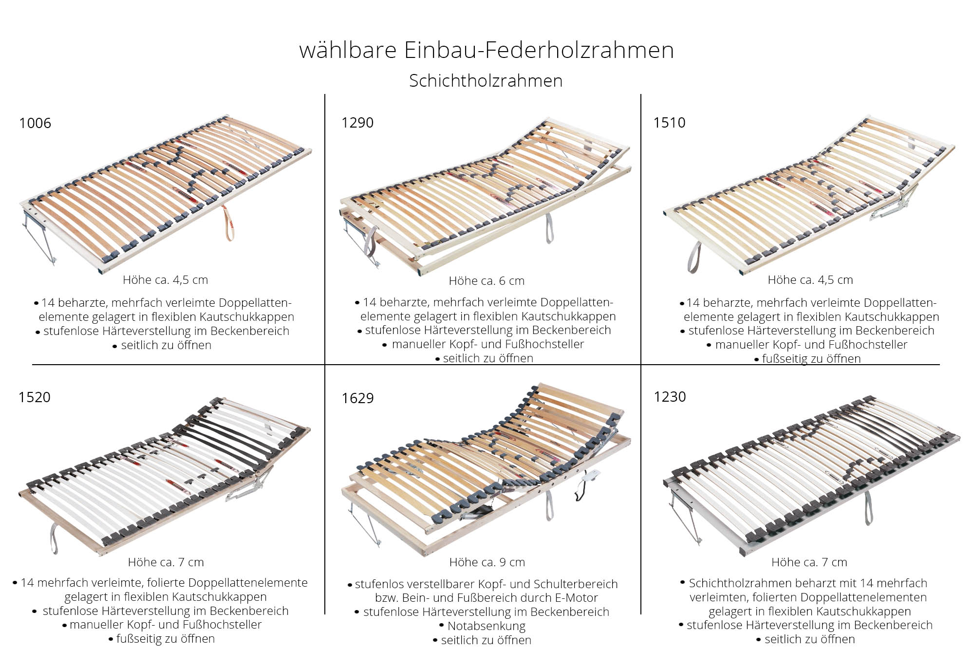 14 Doppellattenelemente mit auf Bolzen gelagerten flexiblen Kautschukkappen, mehrfach verleimte Schichtholzfederleisten, stufenlose Härteverstellung im Beckenbereich