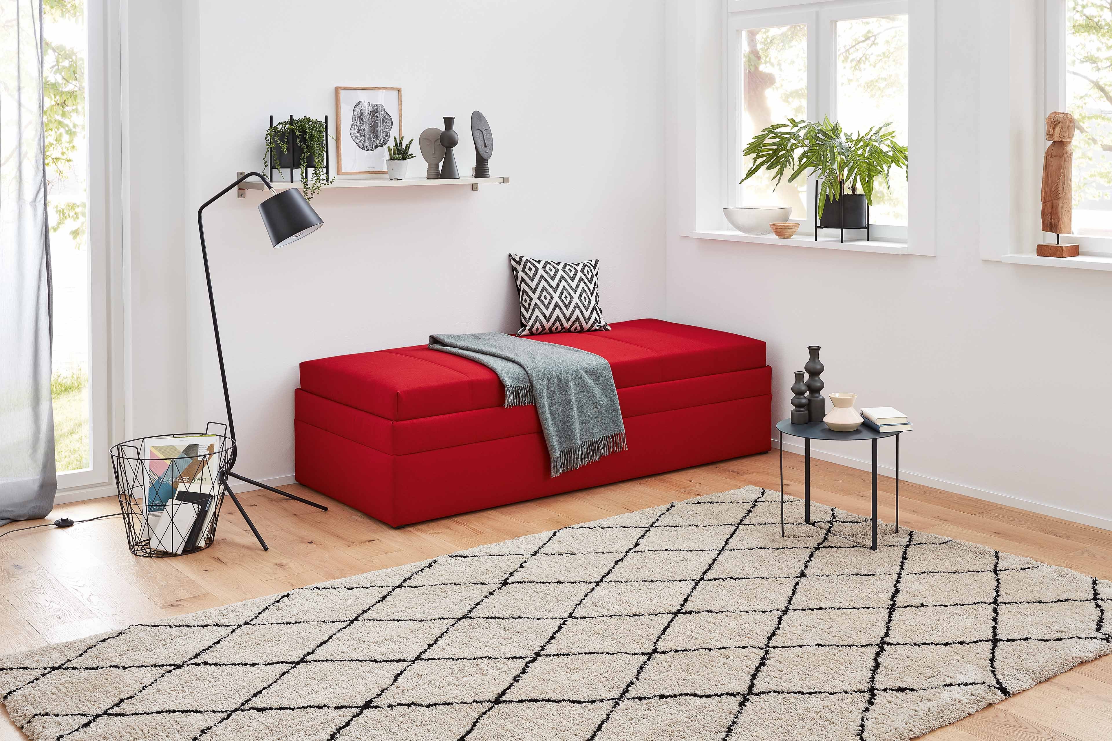 Eine Polsterliege muss keineswegs langweilig oder altbacken aussehen – das beweist hier sehr anschaulich das Modell Pia-Dream von Hapo in seinem knallig roten Flachgewebebezug, der Farbe in jeden Raum bringt. Das ist auch gut so, denn schließlich hat Pia-Dream keinen Grund, sich zu verstecken: Großzügiger Stauraum in dem geräumigen Bettkasten schafft vor allem in kleinen Räumen einen echten Mehrwert. Besonders, wenn die Liege als Gästebett fungieren soll, können hier Bettwaren, Dekokissen und mehr direkt an Ort und Stelle untergebracht werden und sind somit schnell griffbereit. Vielleicht möchten Sie die Liege aber auch als Bett für sich selbst nutzen – auch das ist kein Problem. Wählen Sie einen Lattenrost sowie eine Matratze nach Ihren Wünschen aus, optional ergänzt mit einem komfortablen Topper – Sie werden verblüfft sein, wie bequem selbst ein kleines Polsterbett von Hapo sein kann. Soll die Liege tagsüber als Sitzgelegenheit dienen, dann haben Sie zudem die Möglichkeit, ihr mit den optional hinzubuchbaren Rücken- oder Seitenteilen einen Sofa- oder Recamierelook zu verpassen. Pia-Dream von Hapo – überraschend vielseitig.