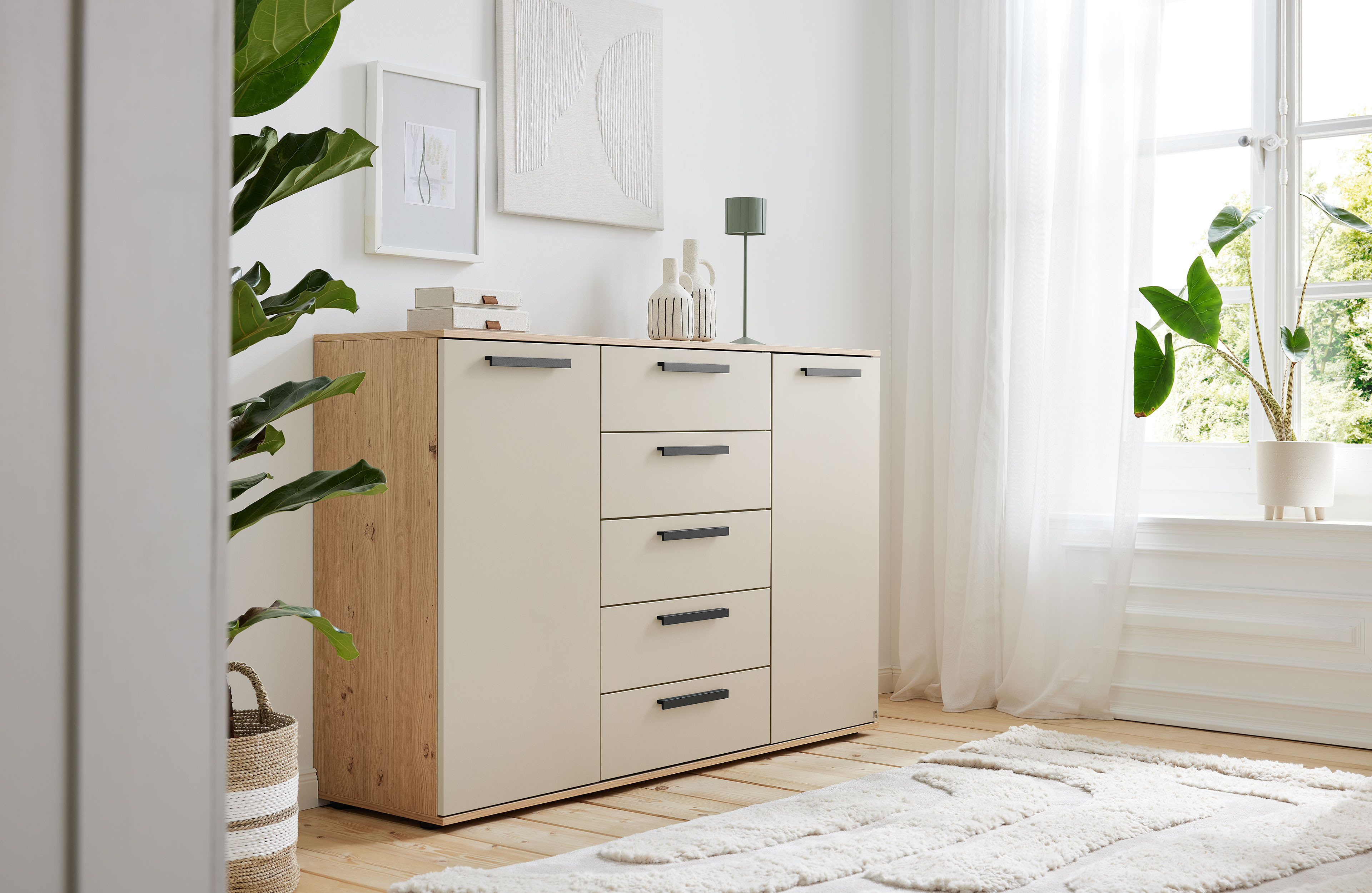 Die Kombikommode Montino von Musterring vereint Design und Funktionalität zu einem Möbelstück, das mit klaren Linien zu überzeugen weiß. Die unaufgeregte Farbkombi aus natürlichem Balkeneiche-Furnier für den Korpus und einem zarten sandfarbenen Lack vermag sowohl Akzente zu setzen als auch harmonisch mit anderen Möbeln zu interagieren. Sie möchten das Möbelstück gern anders kleiden? Dann lohnt sich ein Blick in unsere Zusatzoptionen, die nicht nur Alternativen zur Ausführung zu Verfügung stellen, sondern auch weitere Griffvarianten für Sie bereithalten. Links und rechts neben den fünf Schubkästen, die mit Selbsteinzug, Vollauszug und Softabstoppung glänzen, schmiegen sich jeweils zwei Türenabteile mit je zwei Fachböden an. Sie entscheiden, welche Funktion die Kommode bei Ihnen erfüllen darf und können Sie vielseitig nicht nur im Schlafzimmer, sondern auch im Wohnzimmer, Arbeitszimmer oder auch Speisezimmer einsetzen. Montino von Musterring – so individuell wie Ihr Stil.