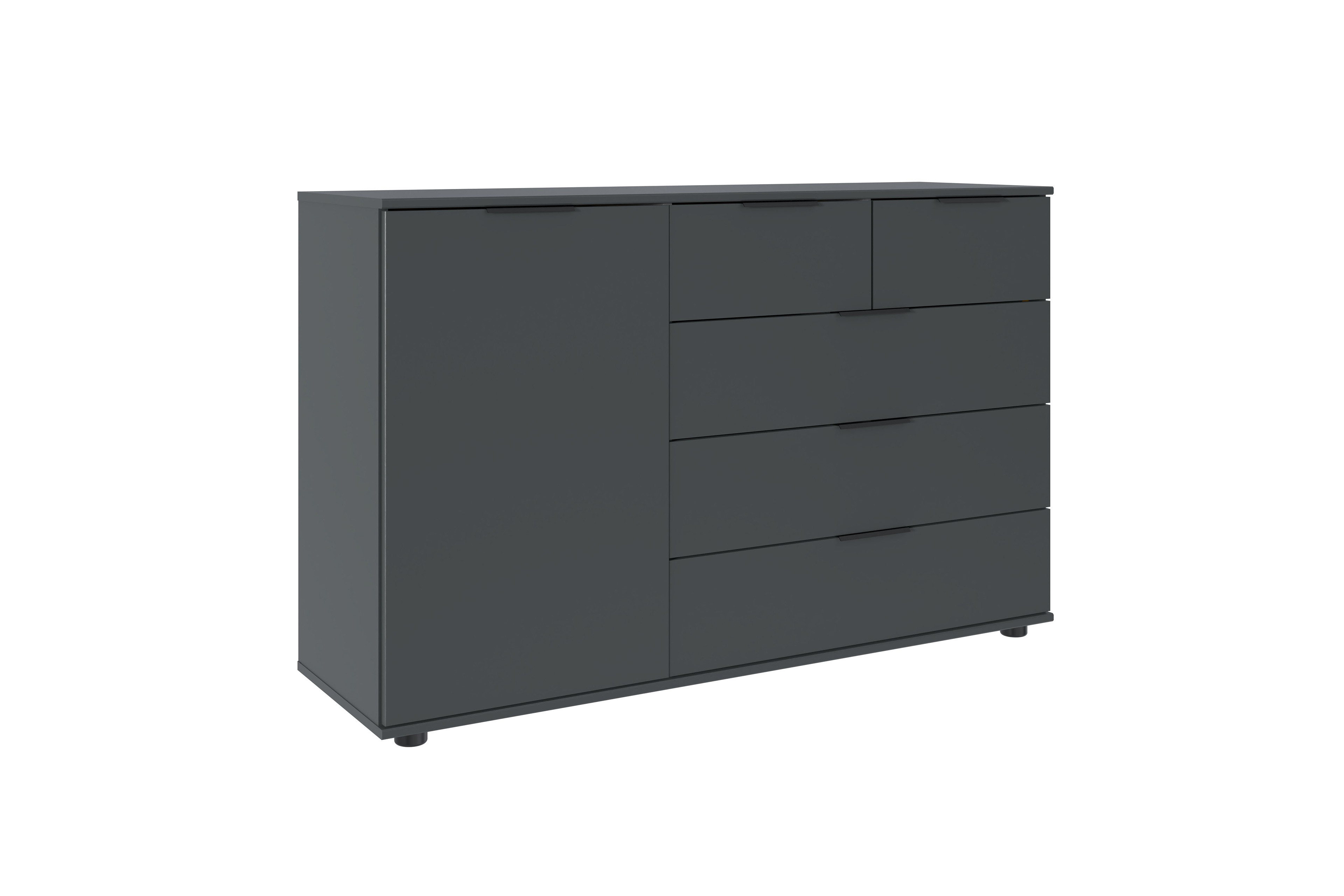 Stellen Sie sich vor, wie Ordnung und Stil Ihren Alltag erleichtern – mit der Tilburg Kombikommode von Wimex. Die Maße von ca. 130 cm in der Breite und etwa 83 cm in der Höhe machen sie zur idealen Begleiterin im Schlafzimmer, Flur oder Ankleidezimmer. Die Wimex Kommode ist groß genug, um Kleidung, Accessoires und Kleinigkeiten ordentlich zu verstauen und dennoch kompakt genug, um sich unaufdringlich in Ihr Zuhause einzufügen. Auf der linken Seite befindet sich eine Tür hinter, der sich ein Einlegeboden versteckt und den Innenraum in zwei Fächer gliedert. Perfekt für Ihre Saisonkleidung, Schuhe oder Handtücher. Rechts sorgen zwei kleine Schubkästen oben und drei größere unten dafür, dass Sie Kleinigkeiten wie Schmuck, Unterwäsche oder Alltagsgegenstände gut sortiert griffbereit halten. Wimex bietet Tilburg in zwei zeitlos eleganten Farbausführungen an: Das freundliche Saharagrau verleiht Ihrem Raum eine warme, wohnliche Note, während der dunkle Grafitton für zeitlose Eleganz steht. Unser Konfigurator eröffnet Ihnen weitere Möglichkeiten, um passende Möbel aus der gleichnamigen Kollektion mitzubestellen. So treffen Möbelstücke im gleichen Design aufeinander und schaffen eine harmonische, durchdachte Einrichtung, die Ihrem Zuhause optische Ruhe schenkt.