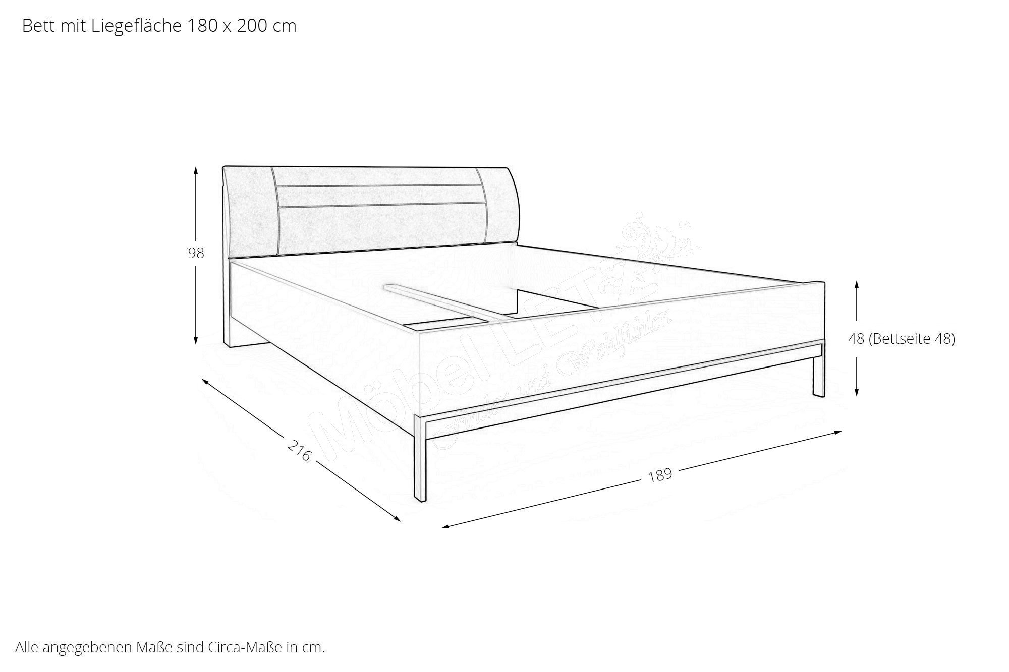 - Bett: Kopfteilhöhe ca. 97 cm, Fußteilhöhe ca. 48 cm, Höhe Oberkante Bettseite ca. 48 cm