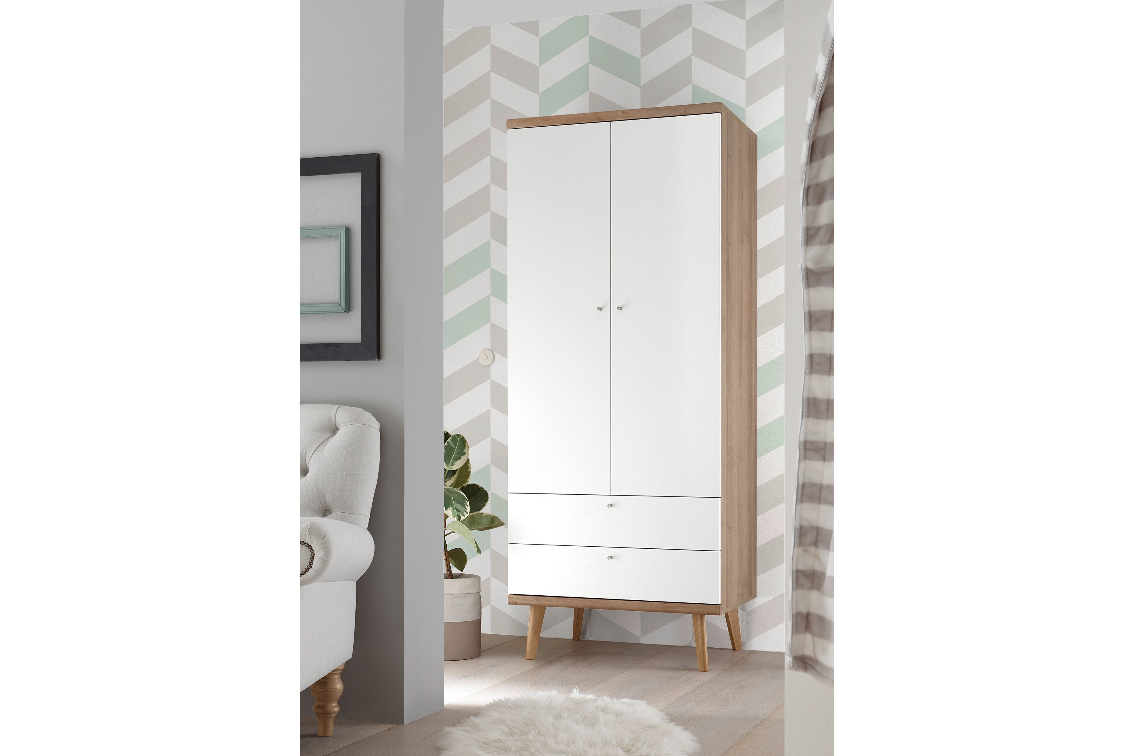 Als platzsparender Aufbewahrungsort für Ihre Bekleidung, der dennoch in Sachen Stauraum-Vielfalt nichts vermissen lässt, eignet sich dieser Kleiderschrank „Lena“ von Kollektion Letz. Das großen Innenelement hinter den zwei Drehtüren ermöglicht Ihnen das Verstauen Ihrer Lieblingsstücke hängend auf Bügeln sowie zusammengefaltet auf dem unteren Boden, während darunter noch zwei breite Schubladen zur Verfügung stehen, um beispielsweise Unterwäsche oder Accessoires darin einzusortieren. Der Korpus und die schmalen Beine des Schrankes bilden in ihrer Eiche Riviera Nachbildung einen natürlich warmen Gegenpol zu den matt weißen Fronten, was dem Möbelstück sein nordisches Flair verleiht. Der kompakte Schrank kann zum Beispiel als Garderobenschrank im Flur verwendet werden, harmoniert aber auch hervorragend mit den anderen Kollektion Letz-Möbeln aus demselben Programm. Ergänzt mit einem Bett und einer Nachtkonsole, welche Sie im zugehörigen Modellkonfigurator finden, macht er aber beispielsweise auch im Jugend- oder Gästezimmer eine ausgezeichnete Figur und wird Ihnen viel Freude bereiten.