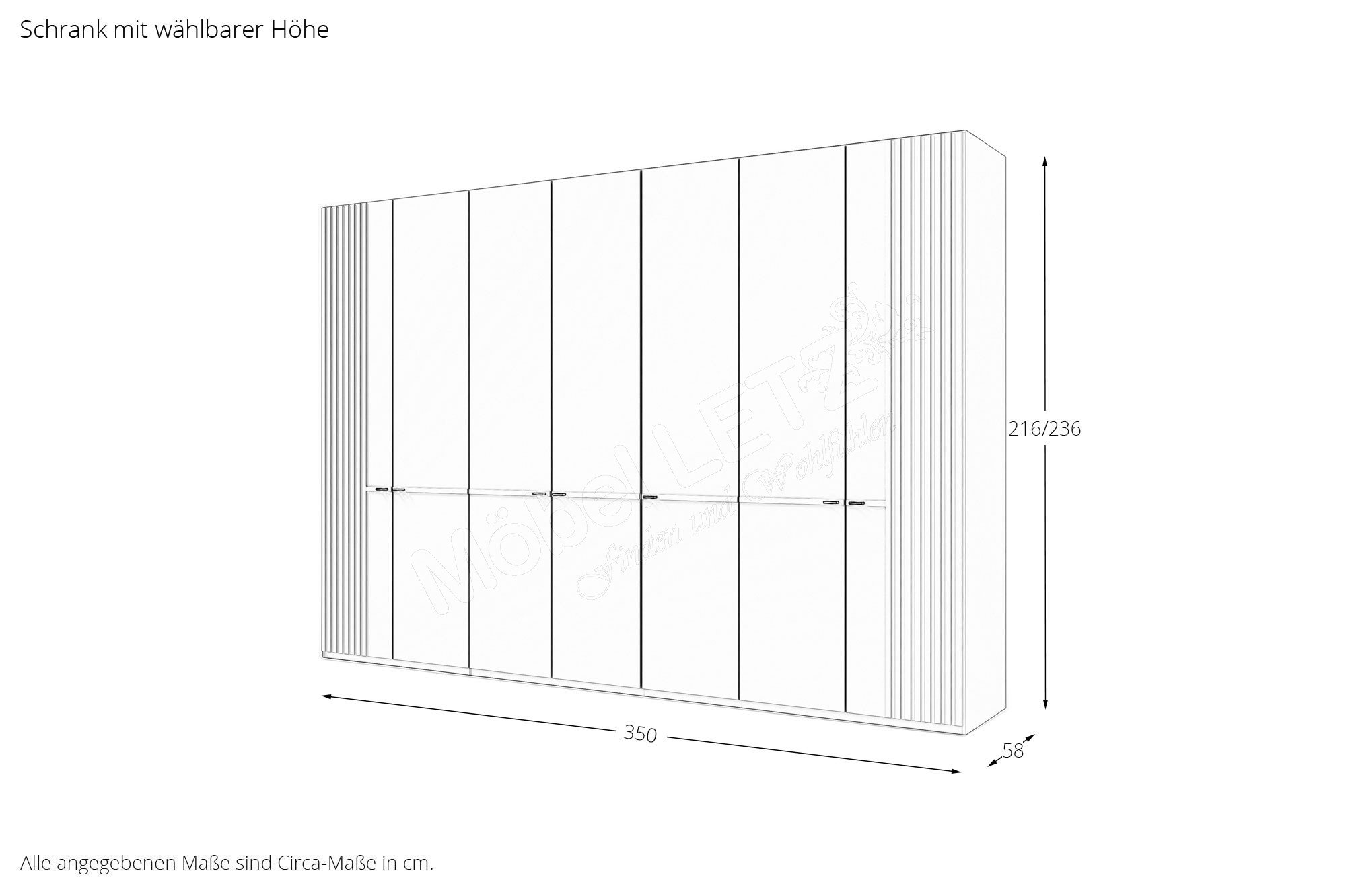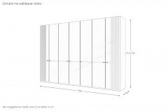 Besonders viel Stauraum erhalten Sie mit dem 7-türigen Musterring Kleiderschrank aus dem Modell MR Isabelle. Er weist eine Breite von etwa 350 cm und eine Tiefe von rund 58 cm auf. Die Schrankhöhe ist zwischen ca. 216 cm und etwa 236 cm wählbar. Im Inneren bietet der fulminante Ordnungshüter drei breite Elemente und ein schmales Abteil mit je zwei Wäscheböden und einer Kleiderstange als Unterbringungsmöglichkeit für zusammengelegte und auf Bügeln hängende Kleidungsstücke an. Diverse Zubehörteile, die wir für Sie in den Zusatzoptionen zusammengestellt haben, können Sie ganz nach Bedarf bestimmen, um das Ordnungssystem zu optimieren. Es stehen Ihnen beispielsweise weitere Wäscheböden, in der Höhe variabel montierbare Schubladen, ein Kleiderlift oder auch eine Utensilienablage zur Wahl. Zudem sind für den Drehtürenschrank ein Innenspiegel sowie eine praktische LED-Innnenbeleuchtung, die aus vier Fachboden-Lichtblenden besteht (3 x für Elementbreite ca. 100 cm und 1 x für Elementbreite ca. 50 cm), zukaufbar. Im Möbel Letz Online-Shop finden Sie bei Bedarf auch bequeme Boxspringbetten und diverse Kommoden, um eine komplette Schlafzimmer-Einrichtung zusammenzustellen.