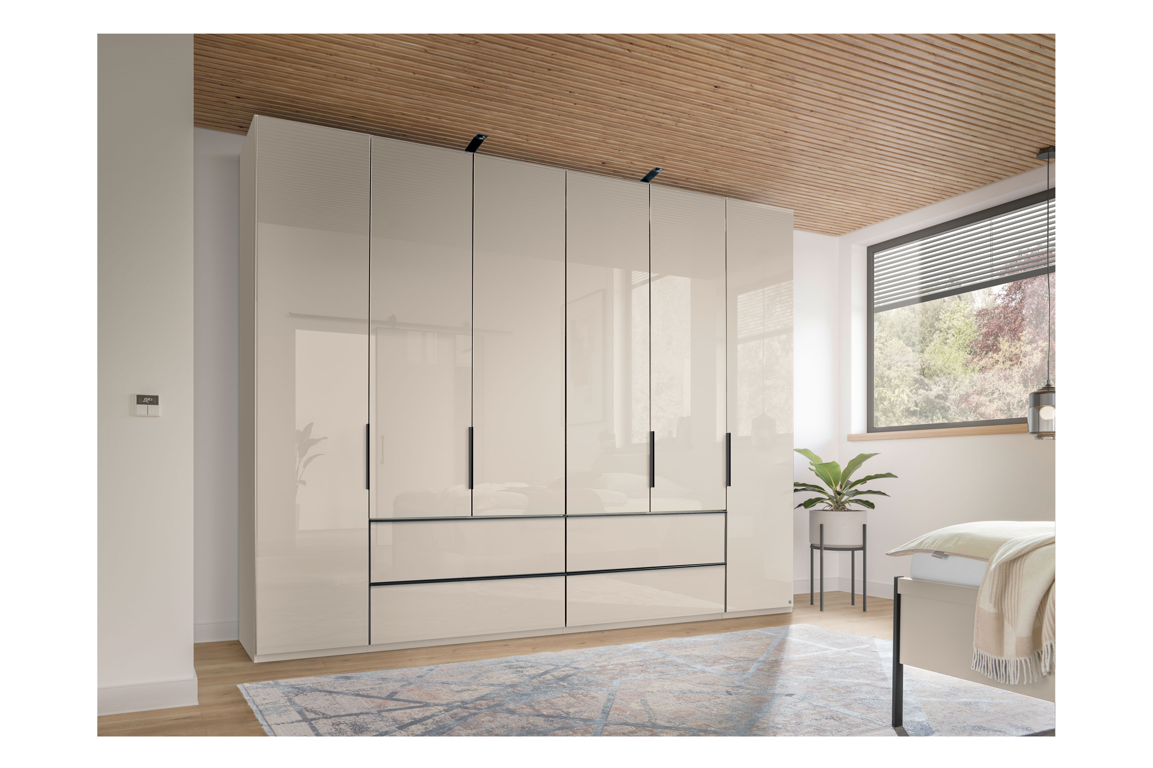 - Kleiderschrank: Falttüren-Funktionsschrank, optisch 6-türig, 2 Drehtüren außen und 2 Falttüren mittig (jeweils 2-teilig), 2 x 2 Schubladen mittig, je ca. 100 cm breit