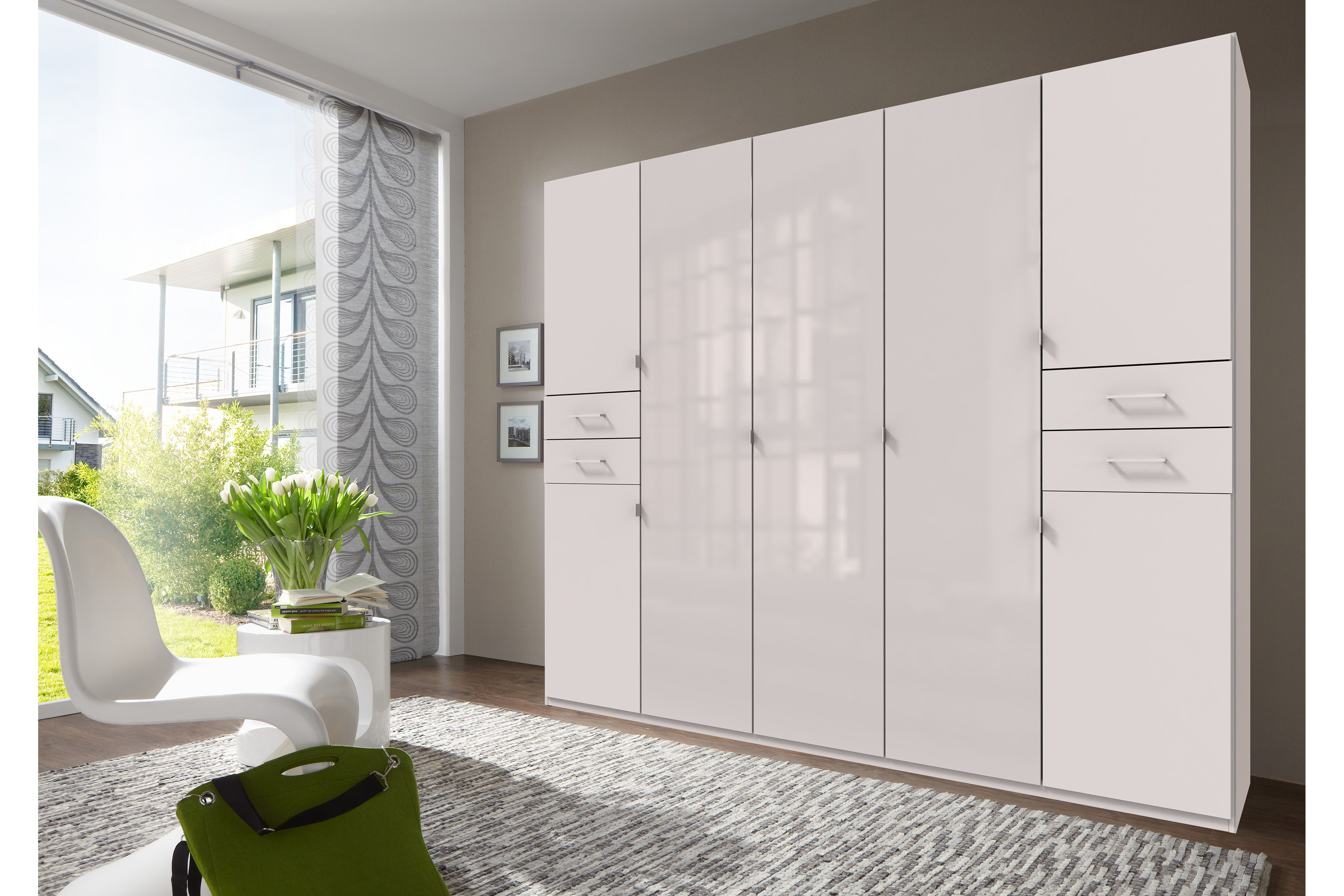 Mit dem Kleiderschrank Danzig von Wimex holen Sie sich edlen Stauraum in Ihr Schlafzimmer. Der geräumige Schrank kombiniert stilvoll Drehtüren mit vier praktischen Schubkästen. Die Schubladen sind dank ihrer durchdachten Höhe bequem erreichbar. Das erleichtert Ihnen sowohl das Einsortieren als auch das Herausholen Ihrer kleineren Wäschestücke und Accessoires. Ein besonderes Stilmerkmal des Wimex Kleiderschranks sind die drei Glastüren, die sich je nach gewählter Farbe in kräftigem Schwarz oder in zeitlosem Weiß zeigen. Mit Danzig bekommen Sie ein tolles vorgefertigtes Ordnungskonzept, das Ihnen viele Fächer und genügend Platz für hängende Kleidungsstücke bietet. Die beiden äußeren Schrankelemente besitzen ober- und unterhalb der Schubladen noch zwei Fachböden. Dadurch stehen Ihnen insgesamt vier Fächer für Ihre Lieblingskleidung zur Verfügung. Die Glastüren verbergen zwei Schrankabteile, die beide mit einer Kleiderstange und einem Wäscheboden ausgestattet sind. Ändern Sie auf Wunsch mit unseren Zusatzoptionen die Farbe von Danzig oder bestellen Sie ganz bequem weitere Einlegeböden und eine passende Schrankbeleuchtung dazu. Freuen Sie sich auf einen Kleiderschrank, der Ihre Mode gut für Sie aufbewahrt und dabei noch tolle Akzente im Schlafzimmer setzt – mit Danzig von Wimex.