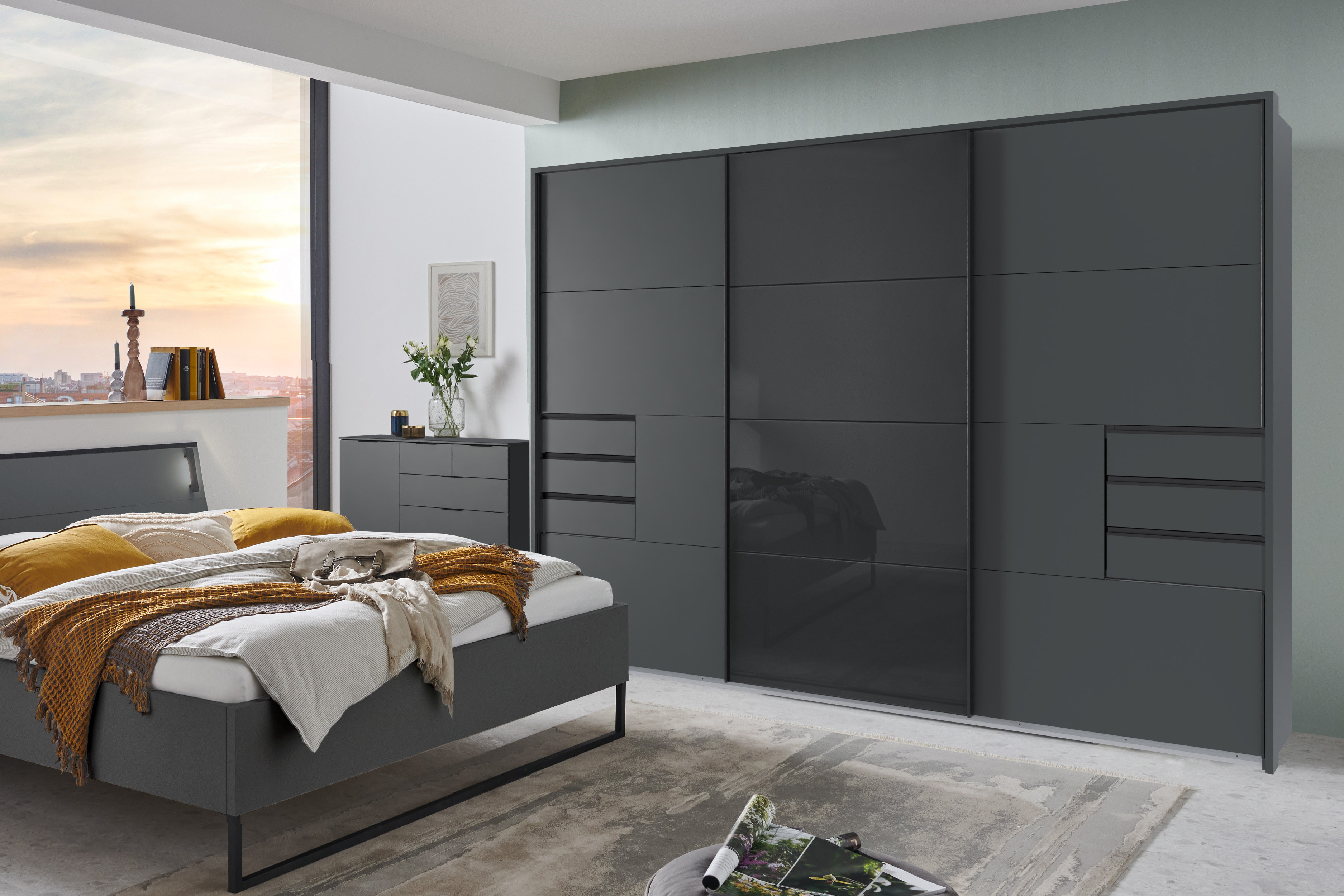 Entdecken Sie den Schwebetürenschrank Tilburg von Wimex – perfekt zugeschnitten auf alle, die einen Schrank mit Stil, viel Raum für Ordnung und für ein schönes Wohngefühl suchen. Mit einer Breite von ca. 270 cm und einer Höhe von etwa 208 cm schenkt Ihnen Tilburg großzügigen Platz, ohne Ihr Schlafzimmer zu überladen. Links und rechts besitzt der Wimex Kleiderschrank je drei integrierte Schubkästen in einer bequem erreichbaren Höhe. Zusätzlich sorgen im Innenraum noch zwei große und zwei kleine Böden für eine gelungene Aufteilung und eine übersichtliche Ordnung. Die mittlere Schrankhälfte bietet zwei Kleiderstangen zum Aufhängen Ihrer Kleidung – so haben Sie Ihre Garderobe schnell griffbereit und stets gut sortiert. Mit dem zugehörigen Konfigurator erweitern Sie Ihre Schrankausstattung und Ihr Schlafzimmer: Weiteres Zubehör und zusätzliche Möbel aus der gleichen Kollektion können Sie hierüber bequem zum Angebot hinzufügen. So entsteht im Nu ein stimmiges, einheitliches Wohnbild, das elegant und modern wirkt. Mit Tilburg können Sie auch aus zwei attraktiven Farbwelten wählen: Den Schwebetürer gibt es in Saharagrau mit einer gleichfarbigen Glastür oder in Grafit mit schwarzem Glas. In der saharafarbenen Ausführung können Sie zusätzlich aus drei verschiedenen Mitteltür-Varianten wählen. Die Schlafzimmermöbel von Wimex vereinen warme, freundliche Ästhetik mit kühler Modernität und passen sich damit jedem Raumkonzept harmonisch an. Erleben Sie, wie Ordnung leicht gelingt, Ihre Outfits schneller auffindbar sind und Möbelstücke aus der gleichen Kollektion eine einheitliche, stilvolle Atmosphäre schaffen.
