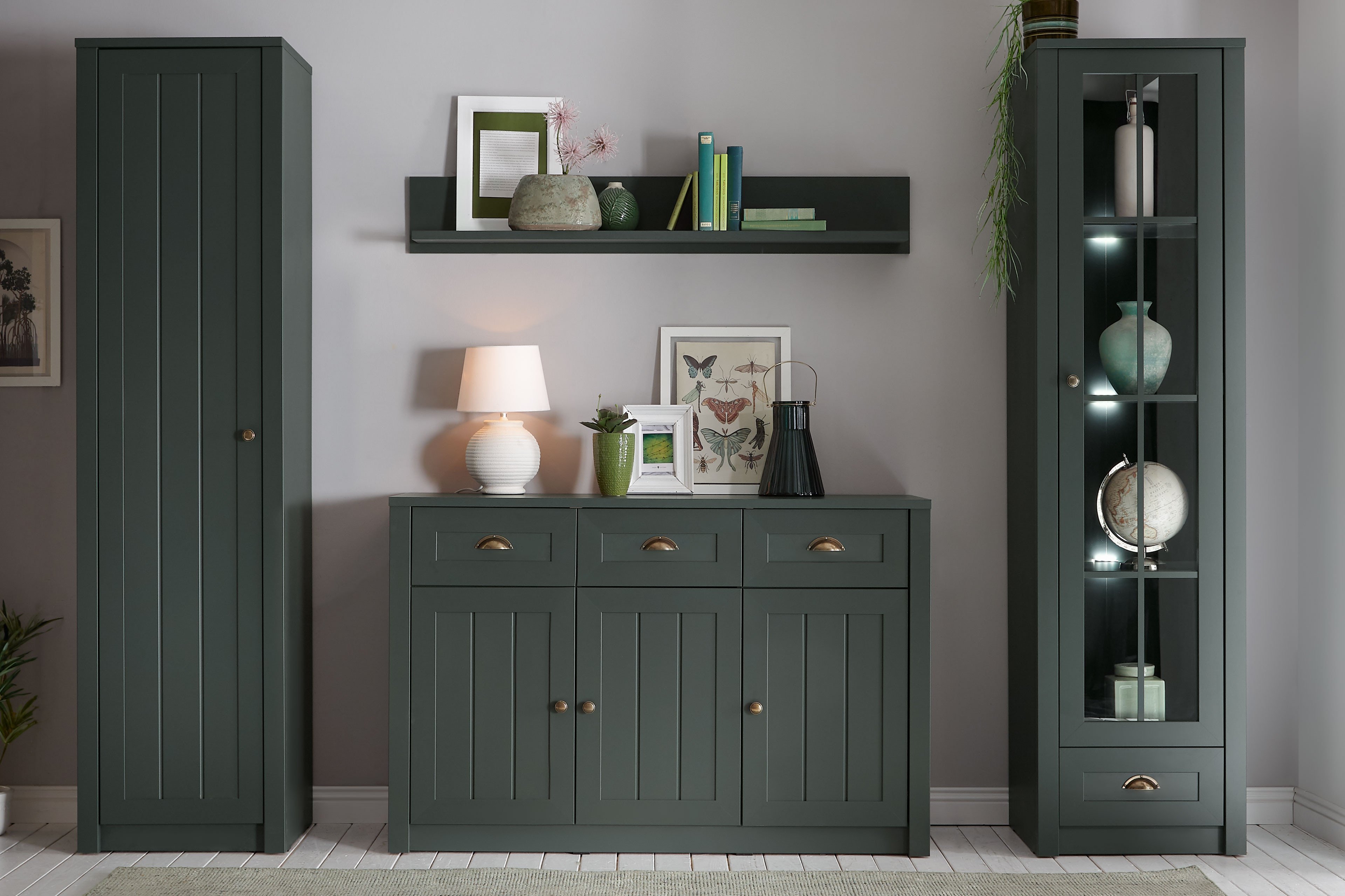 Modern im Landhausstil - so präsentiert sich das Sideboard aus dem Hause des renommierten Herstellers Kollektion Letz. Das Mobiliar aus der Modellreihe Ascot überzeugt mit seiner klassischen und zugleich zeitgemäßen Ausführung in einem eleganten grünen Farbton. Edle Griffe aus Metall runden diesen edlen Look der Kollektion Letz Kommode perfekt ab. Aber dieses wunderschöne Beimöbel überzeugt nicht nur mit einem extravaganten Erscheinungsbild, sondern kann sich auch wunderbar als Stauraumwunder beweisen. Denn hinter den Türen und in den Schubkästen haben Sie ausreichend Unterbringungsmöglichkeiten für Ihre persönlichen Unterlagen und alltäglichen Gegenständen. Reichlich kreative Entfaltungsmöglichkeiten zum Dekorieren und zum Präsentieren werden Ihnen dagegen auf der Ablagefläche gegeben. Machen Sie es sich mit dem Mobiliar von Kollektion Letz aus der Modellreihe Ascot gemütlich und schließen Sie die Augen. Treten Sie ein, in die Welt der endlosen Träume.