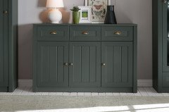 Modern im Landhausstil - so präsentiert sich das Sideboard aus dem Hause des renommierten Herstellers Kollektion Letz. Das Mobiliar aus der Modellreihe Ascot überzeugt mit seiner klassischen und zugleich zeitgemäßen Ausführung in einem eleganten grünen Farbton. Edle Griffe aus Metall runden diesen edlen Look der Kollektion Letz Kommode perfekt ab. Aber dieses wunderschöne Beimöbel überzeugt nicht nur mit einem extravaganten Erscheinungsbild, sondern kann sich auch wunderbar als Stauraumwunder beweisen. Denn hinter den Türen und in den Schubkästen haben Sie ausreichend Unterbringungsmöglichkeiten für Ihre persönlichen Unterlagen und alltäglichen Gegenständen. Reichlich kreative Entfaltungsmöglichkeiten zum Dekorieren und zum Präsentieren werden Ihnen dagegen auf der Ablagefläche gegeben. Machen Sie es sich mit dem Mobiliar von Kollektion Letz aus der Modellreihe Ascot gemütlich und schließen Sie die Augen. Treten Sie ein, in die Welt der endlosen Träume.