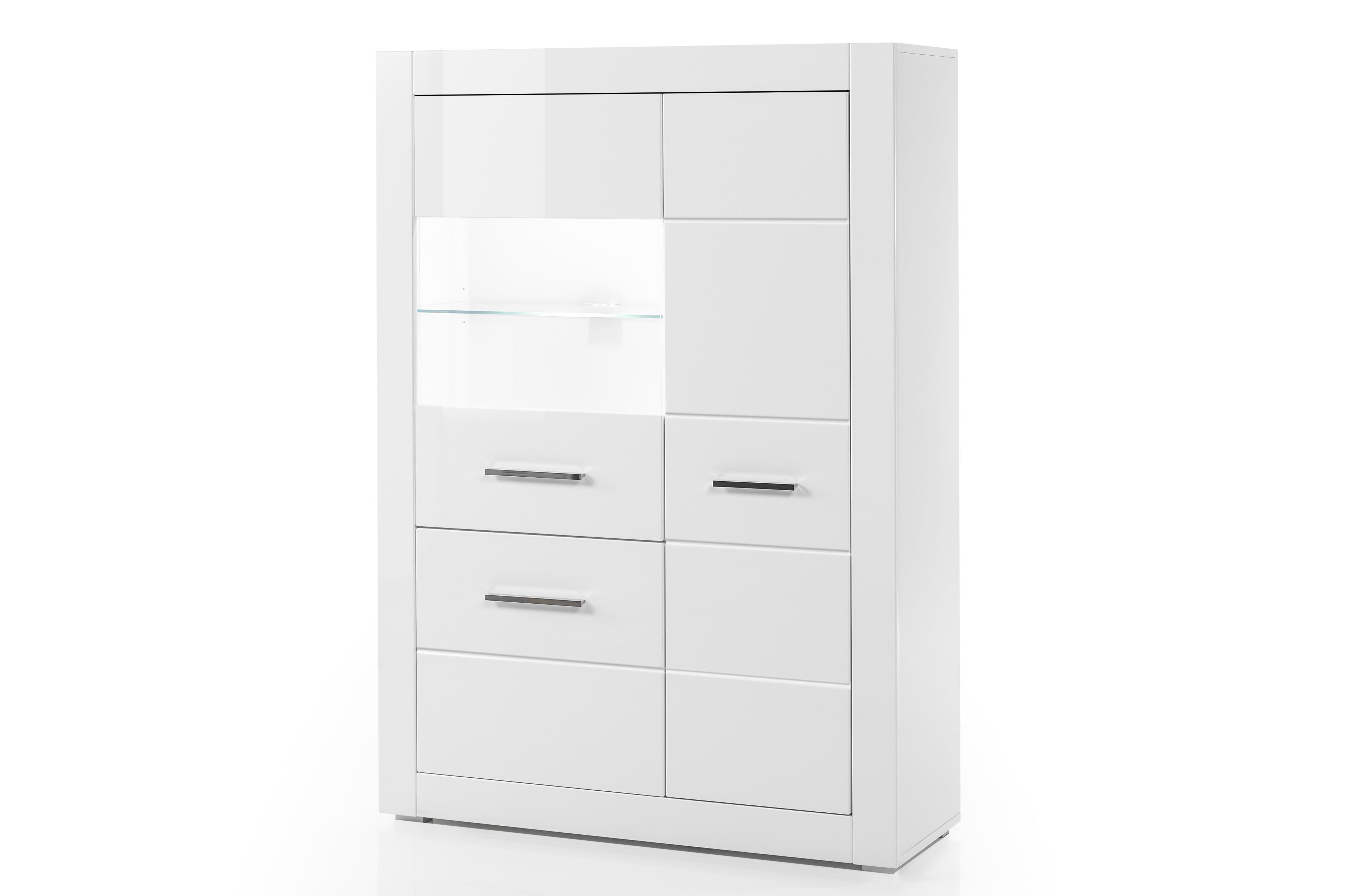 Sie sind auf der Suche nach einem Möbelstück, welches sich in jedem Wohnbereich bestens integrieren lässt? Dann ist das Highboard von Kollektion Letz aus der Modellreihe Bianco genau das Richtige für Sie und Ihr Zuhause. Denn dieses Schmuckstück lässt sich nicht nur wunderbar mit bereits bestehenden Einrichtungsmöbeln kombinieren, sondern glänzt auch grandios als Einzelmöbel. So findet dieses elegante Highboard in Ihrem Eingangsbereich, in Ihrem Wohnzimmer oder aber auch in Ihrem Speisezimmer einen geeigneten Platz. Darüber hinaus punktet dieses Möbelelement mit beachtlichen Unterbringungsmöglichkeiten für Ihre alltäglichen Utensilien, für Ihre saisonalen Accessoires oder für Ihr kostbares Geschirr. Diverse Dekorationsartikel oder geliebte Erinnerungsstücke werden hinter dem Glasausschnitt gekonnt in Szene gesetzt und mit der optionalen Beleuchtung perfekt ausgeleuchtet. Erleben Sie das wundervolle Ambiente in Ihrem Zuhause und machen Sie es sich gemütlich mit dem Mobiliar von Kollektion Letz aus der Modellreihe Bianco.